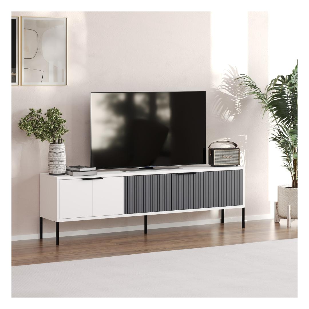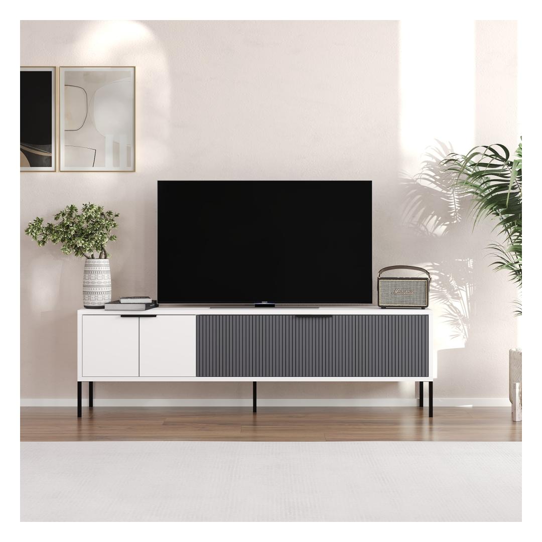 Transform your living room into a stylish and modern space with our sleek TV stand. This TV stand is not just a piece of furniture, it's a statement of your taste and personality. The combination of white and anthracite colors adds a touch of sophistication to any room, while the 18mm thick melamine coated particle board ensures durability and longevity.