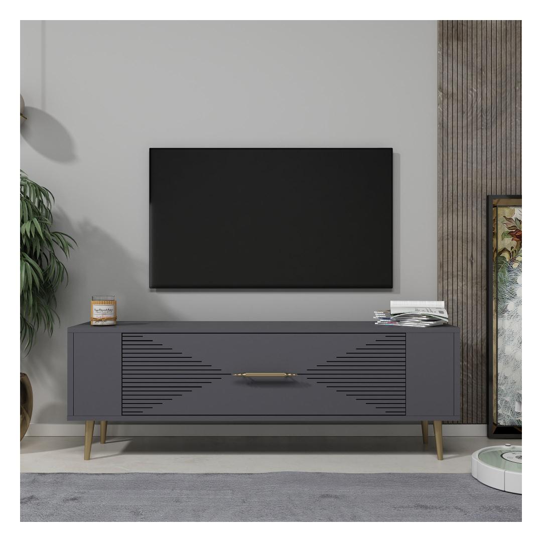 Transform your living room into a stylish and sophisticated space with our stunning TV stand. Made from 100% melamine coated particle board, this TV stand is not only durable but also incredibly elegant. The combination of anthracite and gold colors adds a touch of luxury to your home decor, making it the perfect centerpiece for your entertainment area.