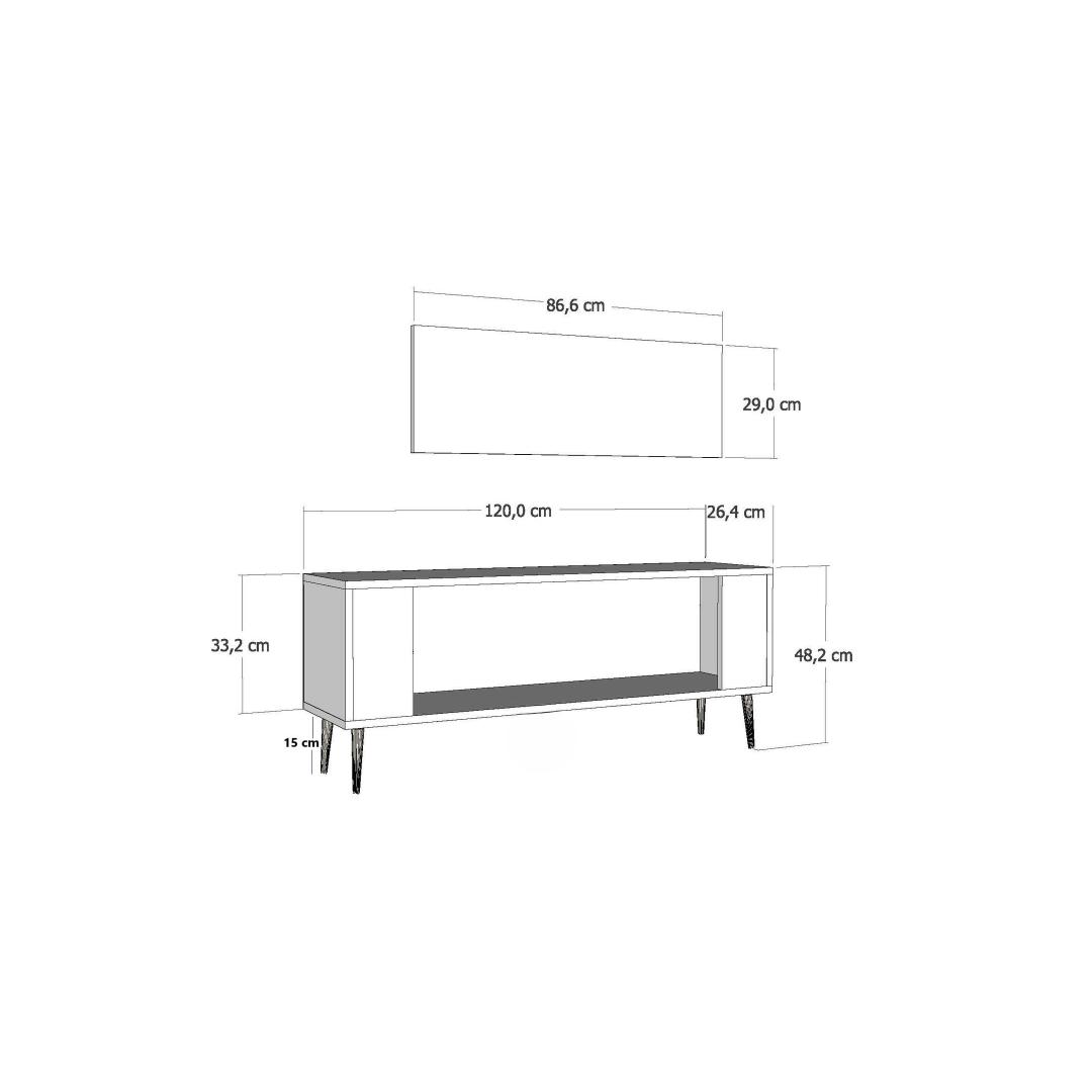 With a width of 120 cm, height of 48.2 cm, and depth of 26.4 cm, this TV stand is the perfect size for most living rooms. The shelf width of 86.6 cm and shelf height of 29 cm provide plenty of space for your TV, gaming consoles, sound system, and more. The legs are 15 cm high and can be fixed to the wall for added stability.