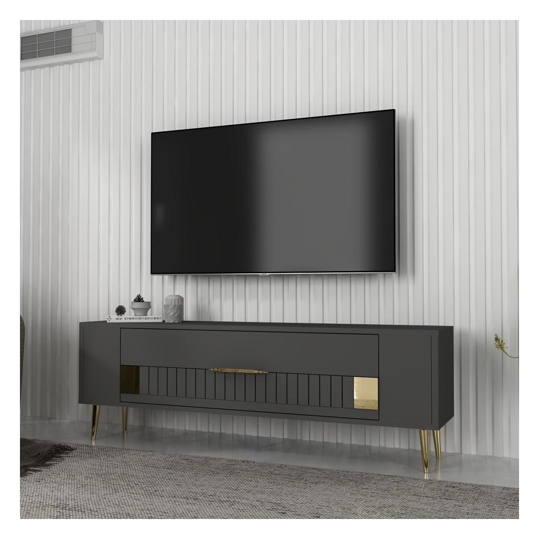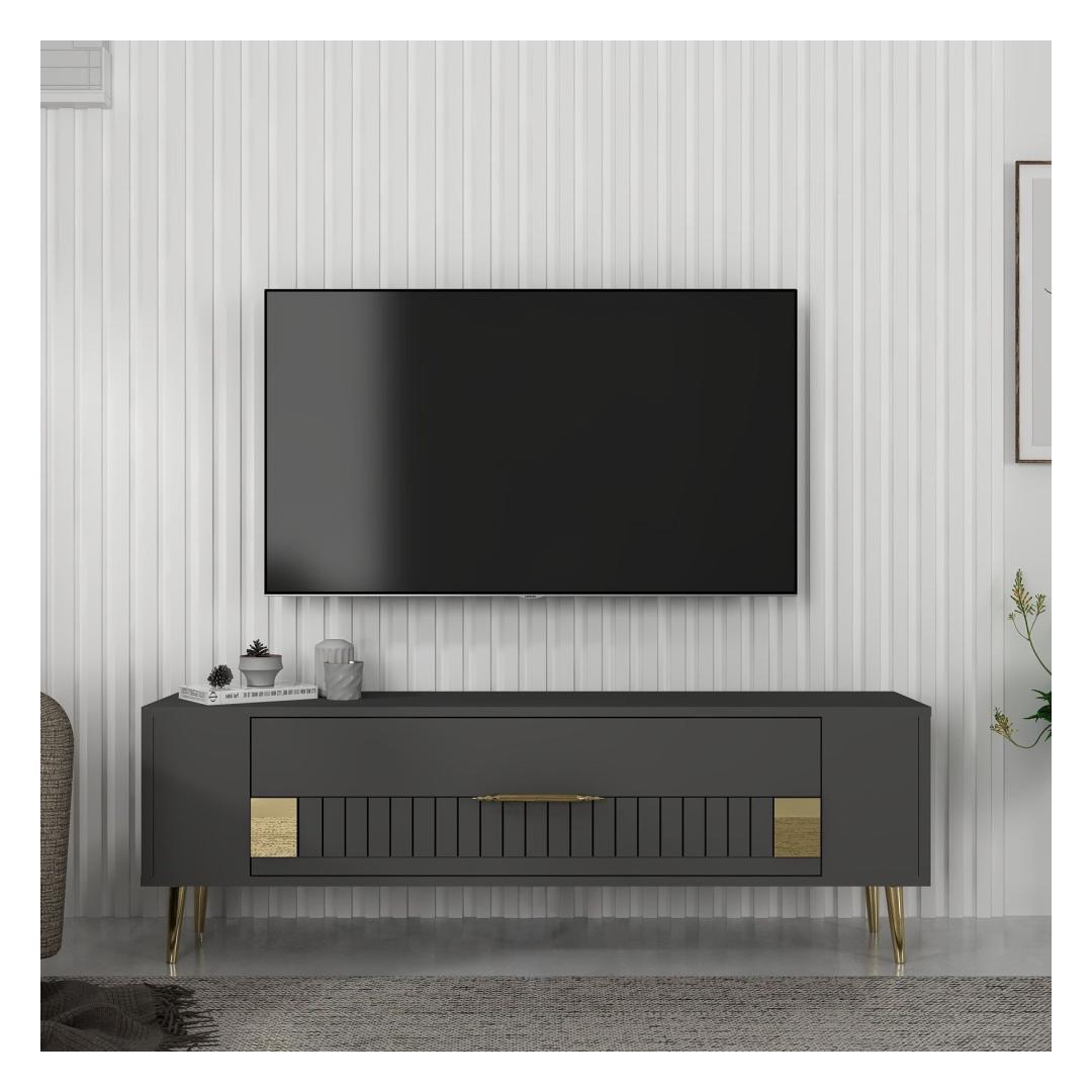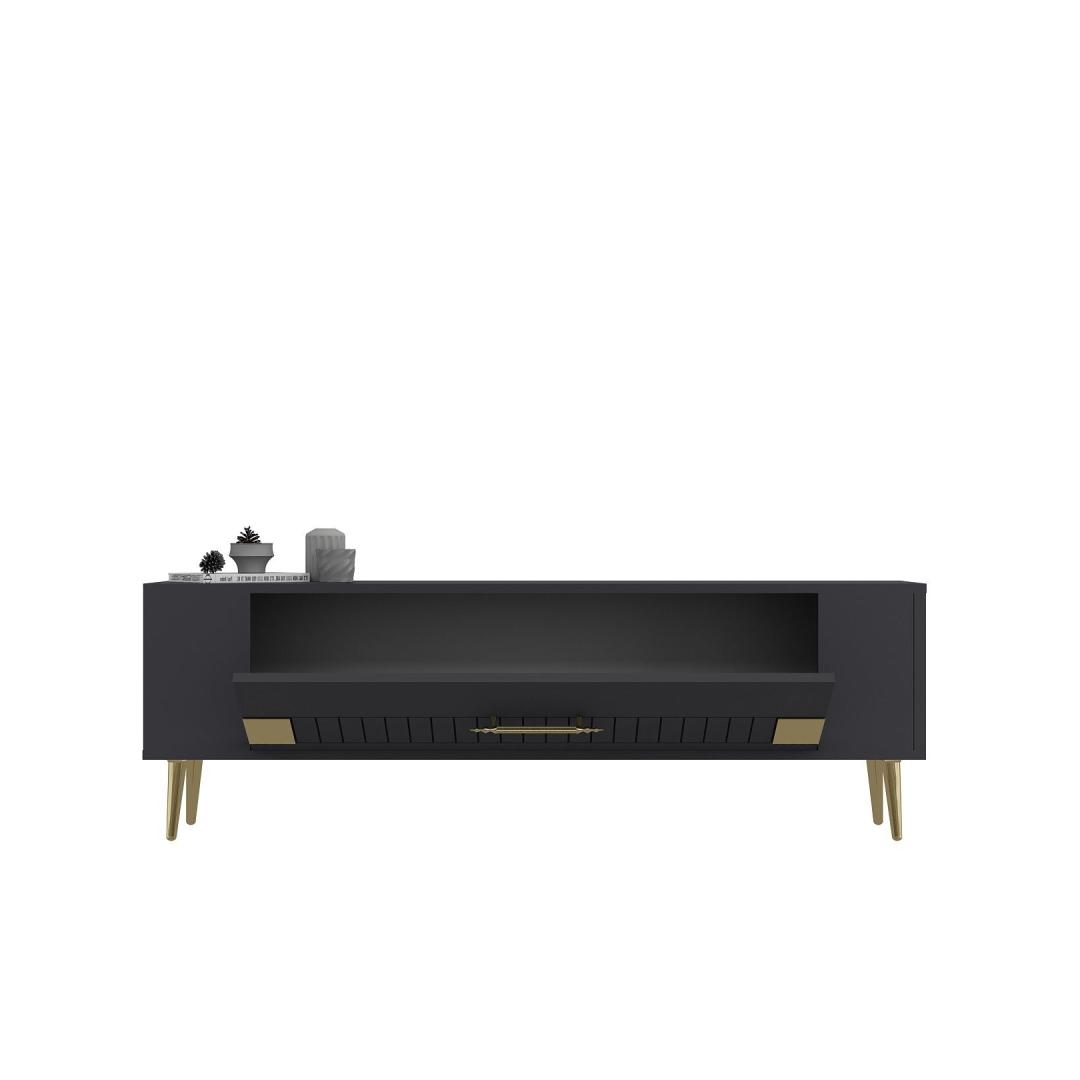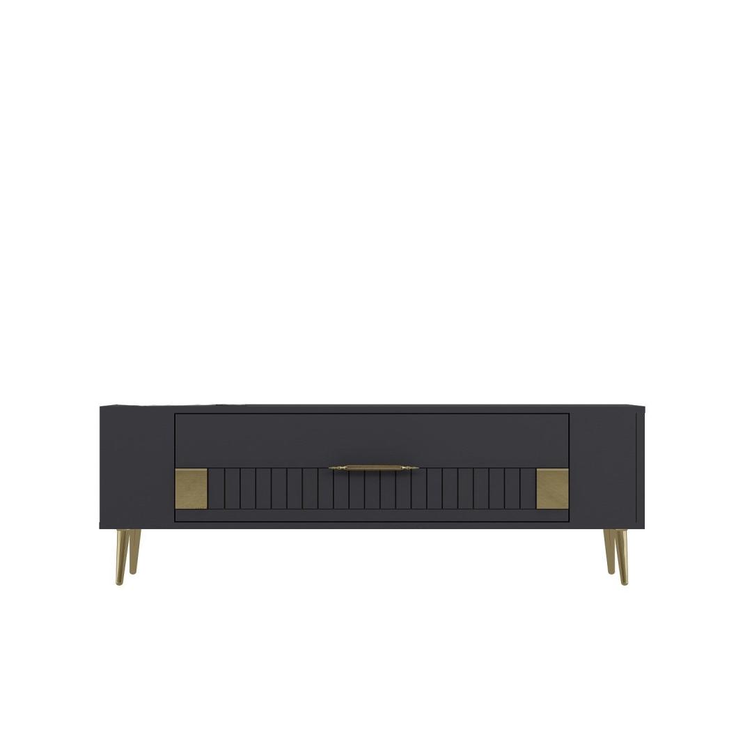 Transform your living room into a stylish and sophisticated space with our stunning TV stand. Made from 100% melamine coated particle board, this TV stand is not only durable but also incredibly elegant. The combination of anthracite and gold colors adds a touch of luxury to your home decor, making it the perfect centerpiece for your entertainment area.