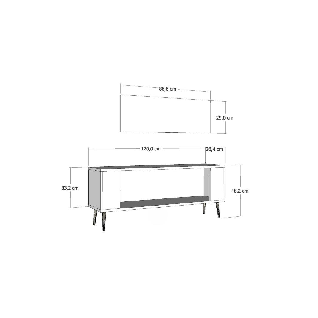 Measuring 120 cm in width, 48.2 cm in height, and 26.4 cm in depth, this TV stand offers ample space for your television and media accessories. The shelf width of 86.6 cm and shelf height of 29 cm provide additional storage for your DVDs, gaming consoles, or decorative items. The legs are 15 cm in height, giving the stand a stable base.