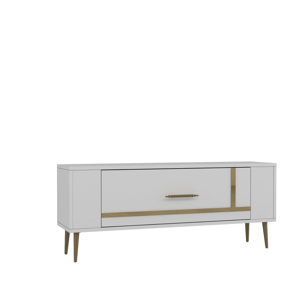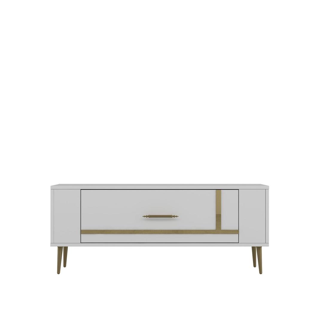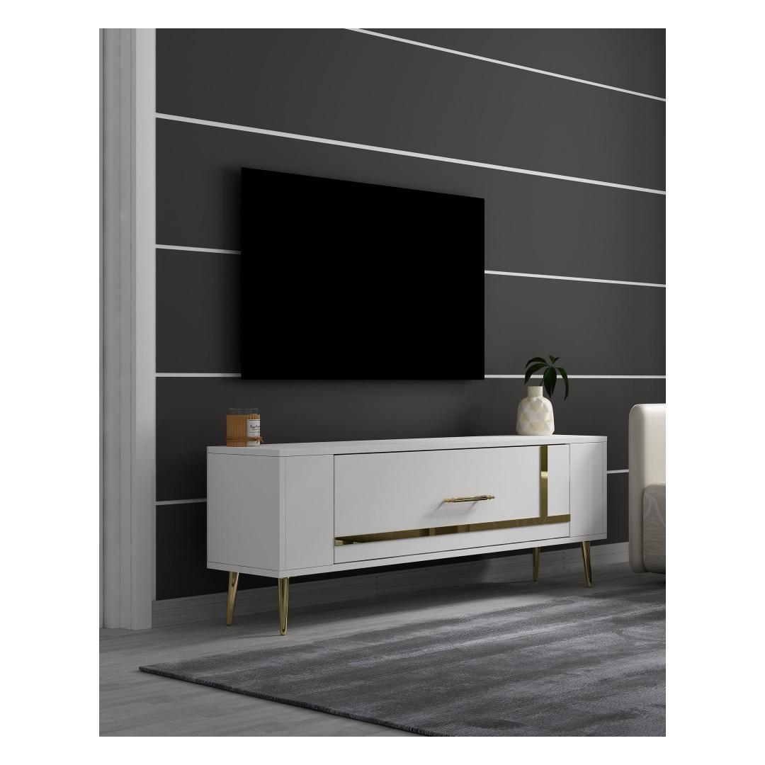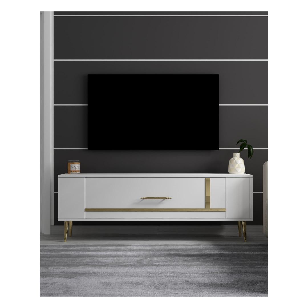 Transform your living room into a luxurious and stylish space with our White and Gold TV Stand. This exquisite piece is not just a simple TV stand, it is a statement piece that will elevate the look of your entire room. The combination of white and gold colors exudes elegance and sophistication, making it the perfect addition to any modern home decor.
