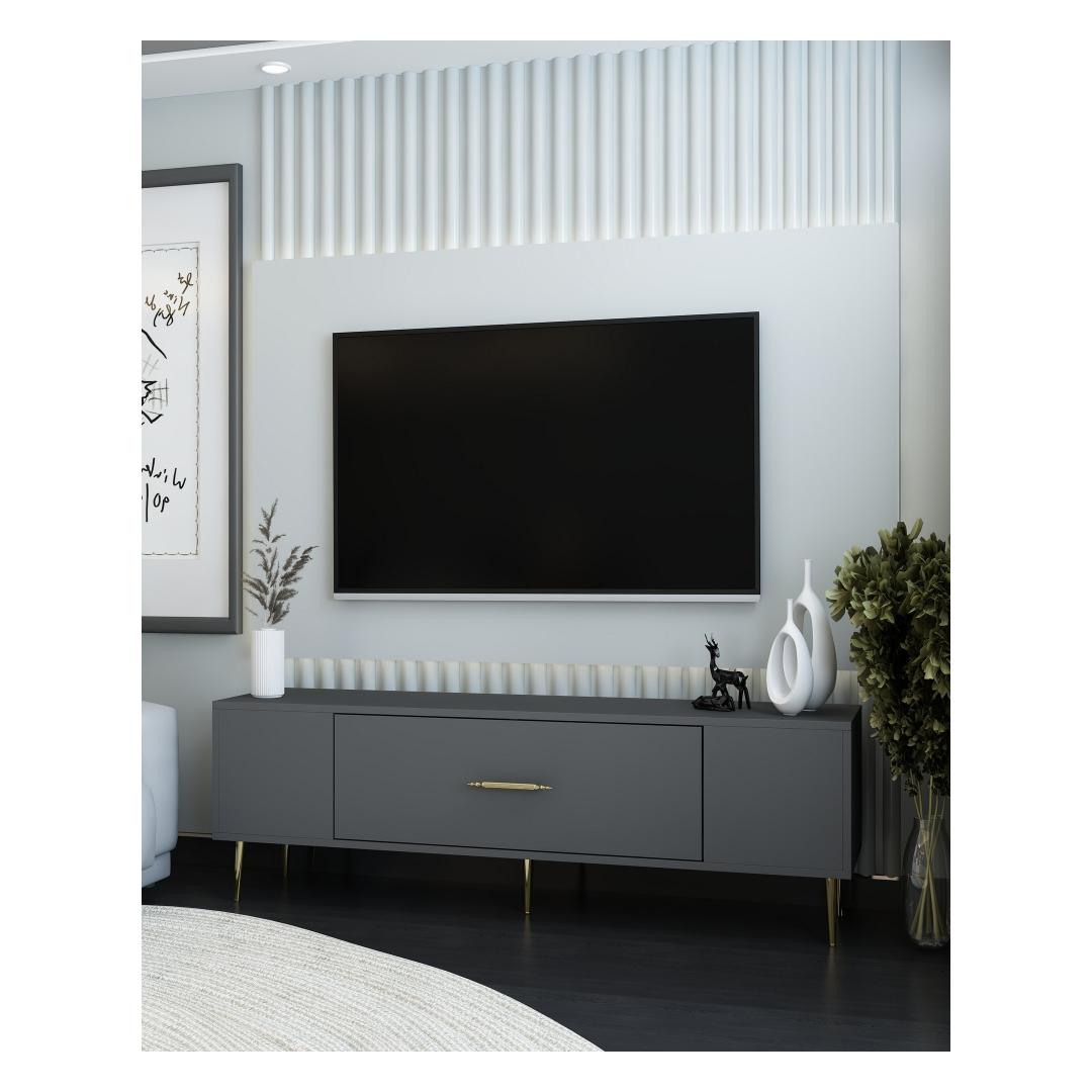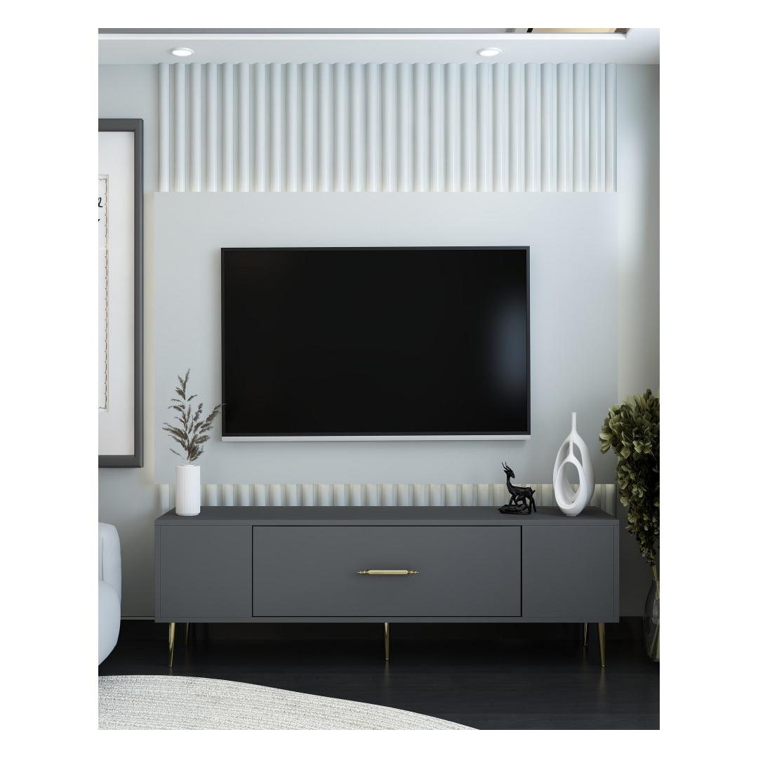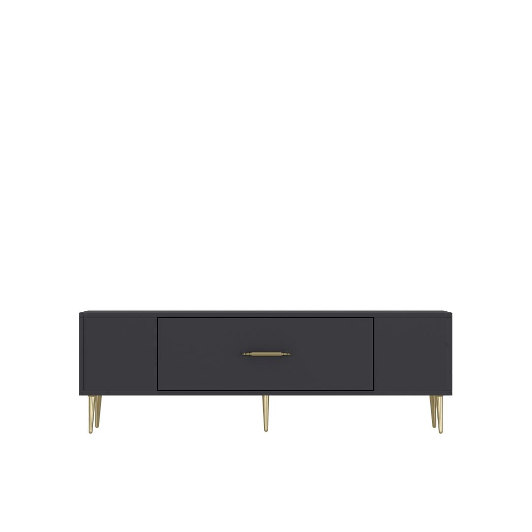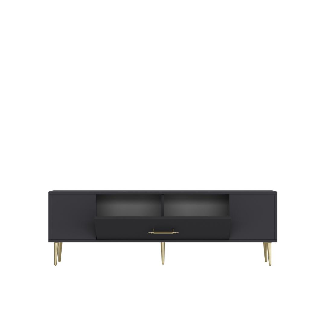 Imagine coming home after a long day and relaxing in front of your TV on this beautiful TV stand. The sleek design and modern color combination of anthracite and gold will instantly upgrade the look of your living space, making it feel more luxurious and inviting.