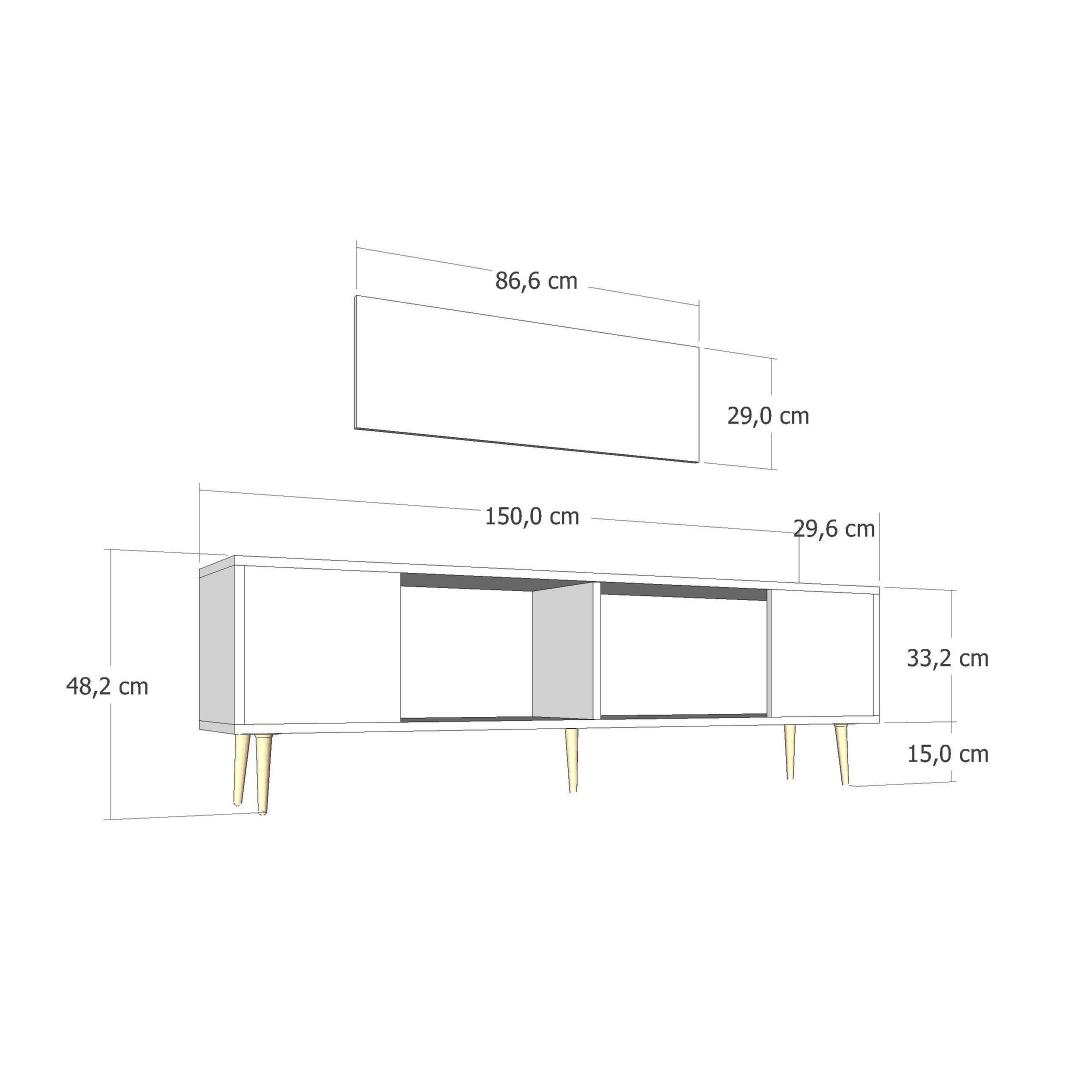 Made from 100% melamine coated particle board, this TV stand is not only stylish but also durable and long-lasting. The 18mm thickness ensures sturdiness, while the precise measurements of 150cm in width, 48.2cm in height, and 29.6cm in depth make it the perfect fit for most living rooms. The 15cm leg height adds a touch of elegance and sophistication to the overall design.