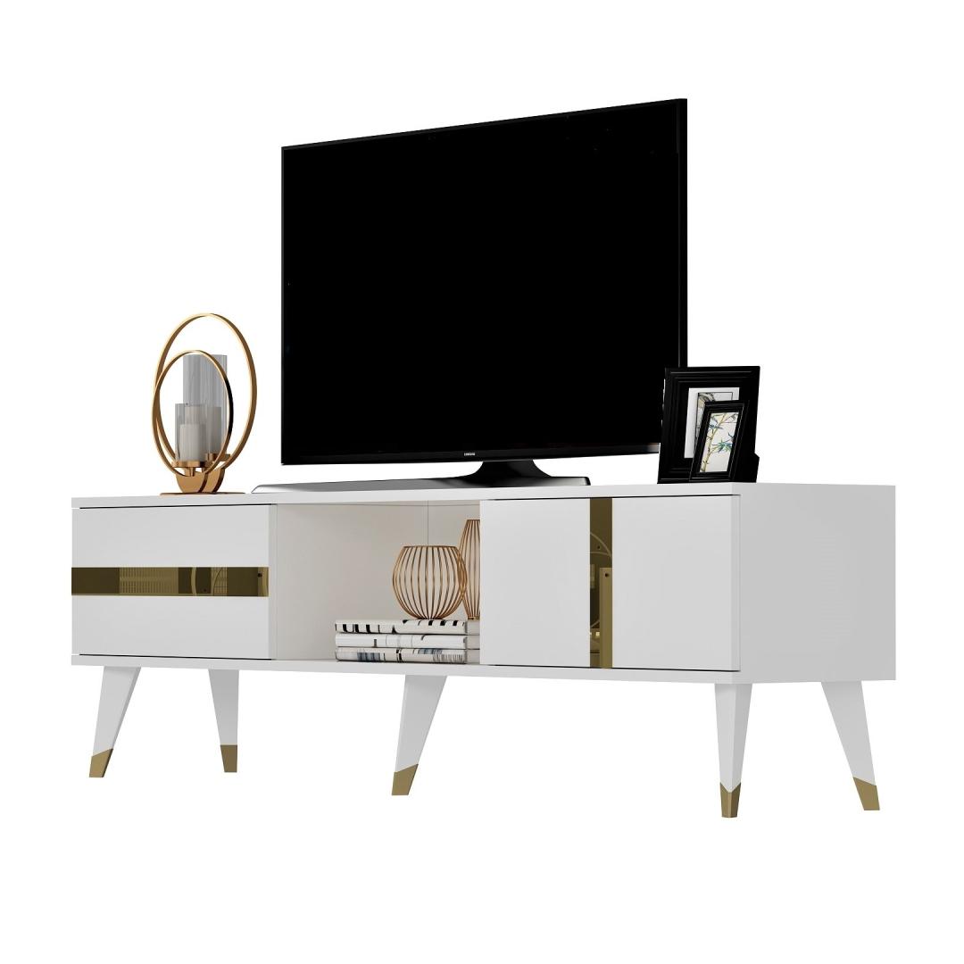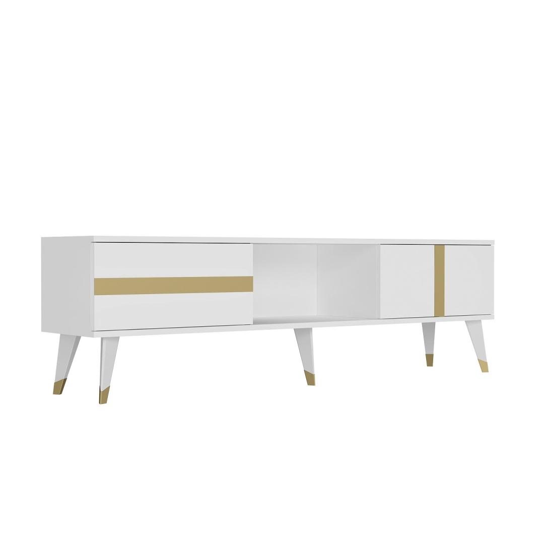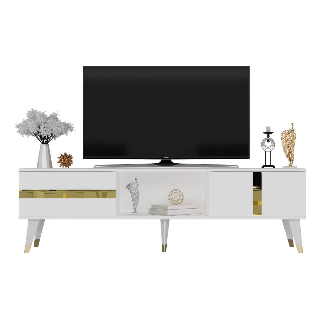 The combination of white and gold colors creates a visually striking contrast that instantly catches the eye. The sleek and modern design of this TV stand effortlessly complements any interior decor, making it a versatile addition to your home.