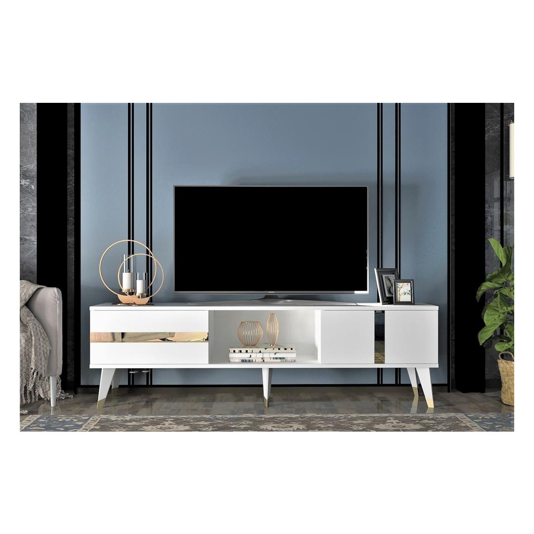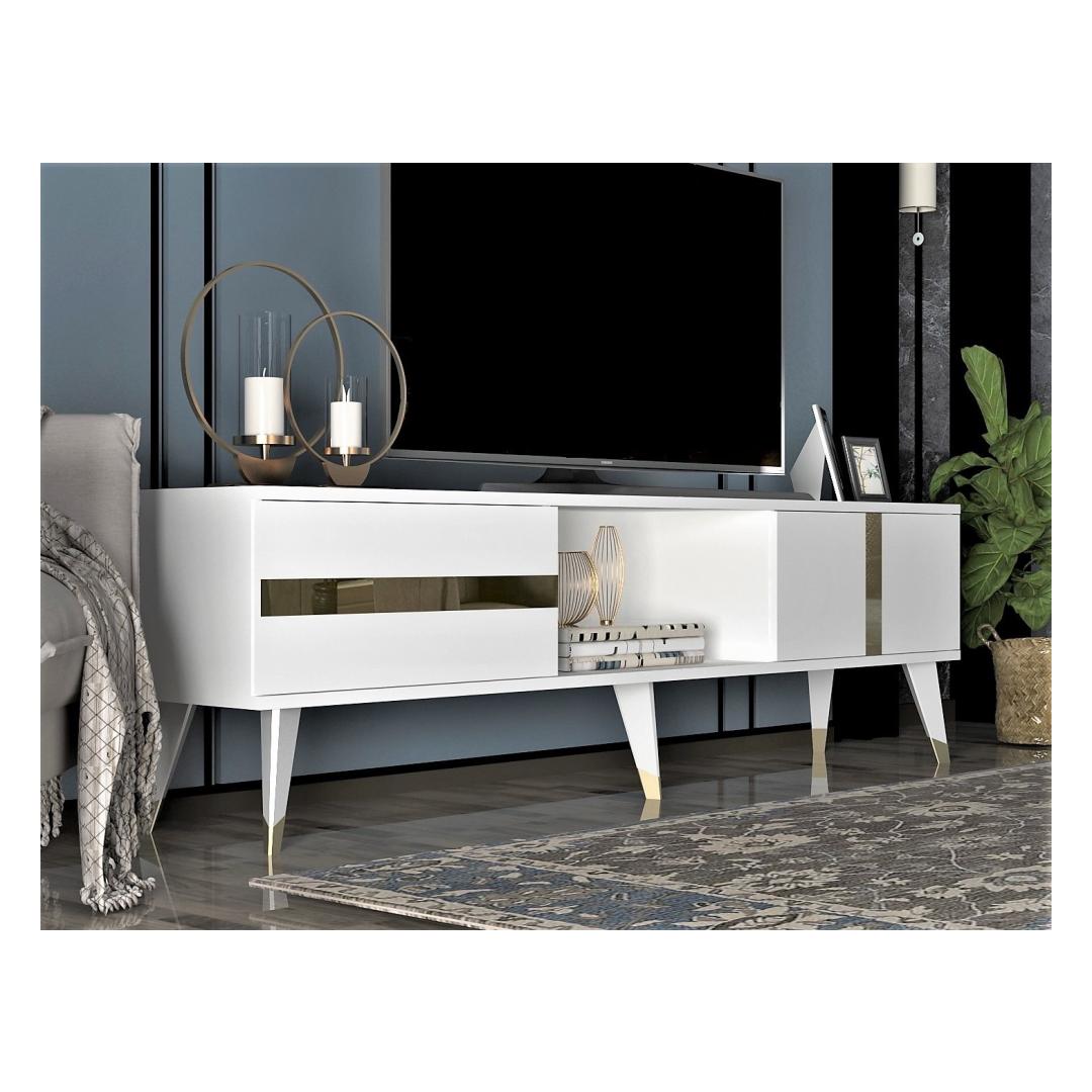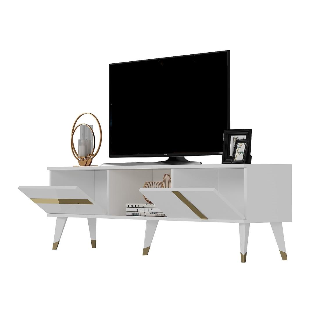 The combination of white and gold colors creates a visually striking contrast that instantly catches the eye. The sleek and modern design of this TV stand effortlessly complements any interior decor, making it a versatile addition to your home.