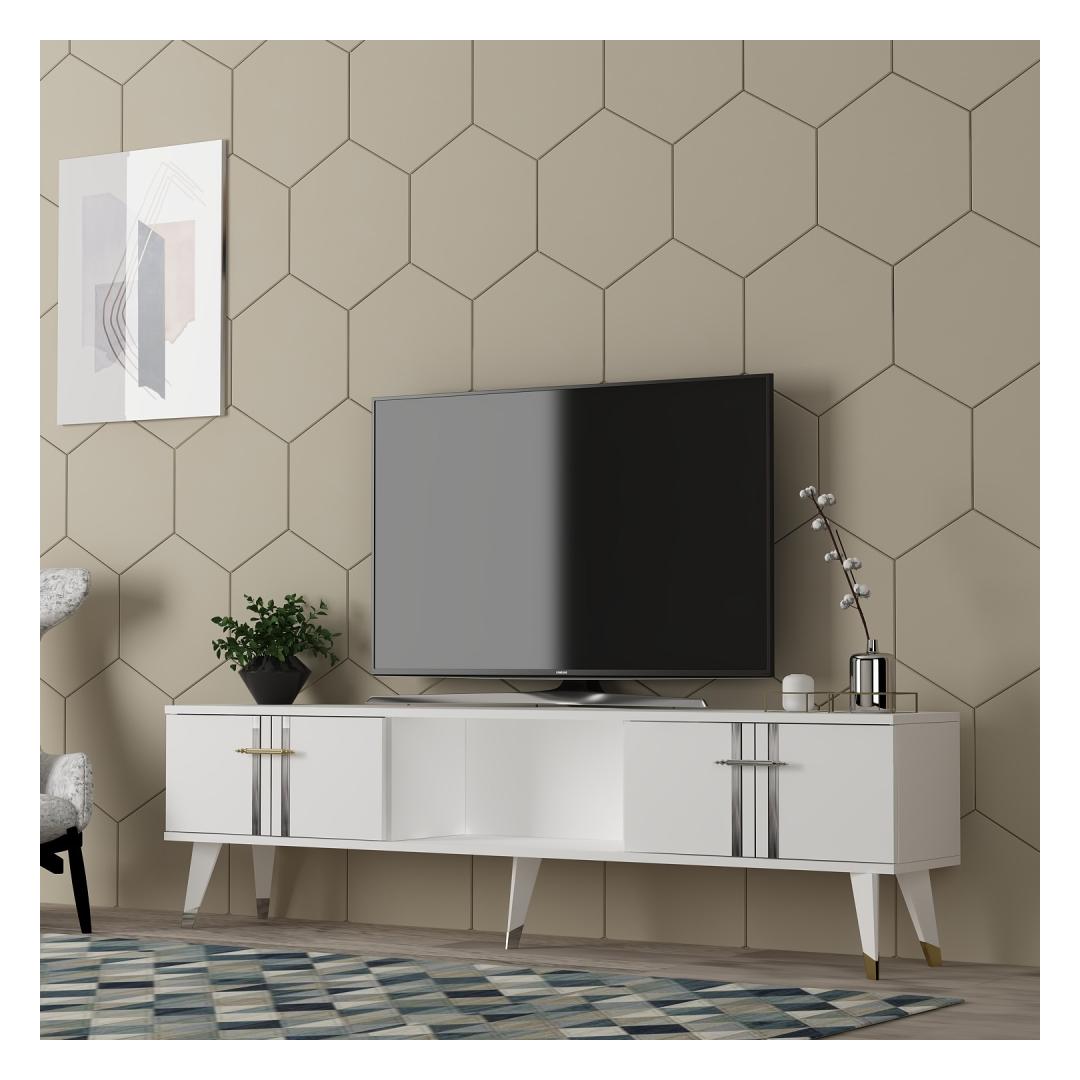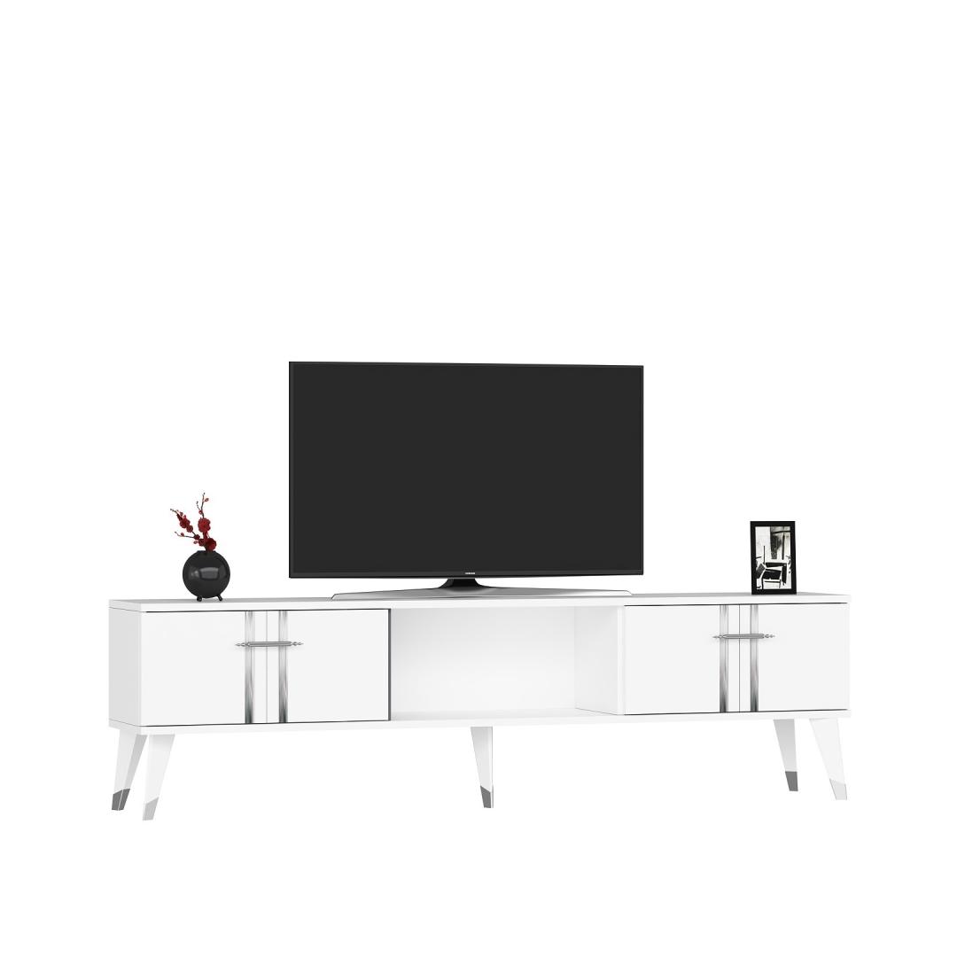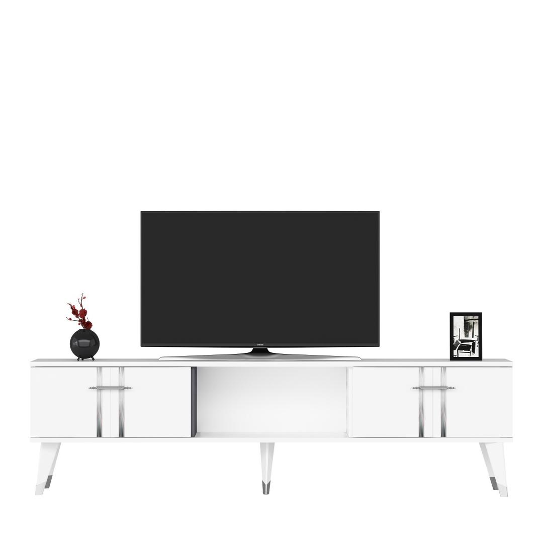 Say goodbye to clutter and hello to organization with this TV stand. With ample storage space for all your media essentials, you can finally keep your living room neat and tidy. The white and silver color combination adds a touch of elegance and sophistication to any space, making it the perfect addition to your home decor.
