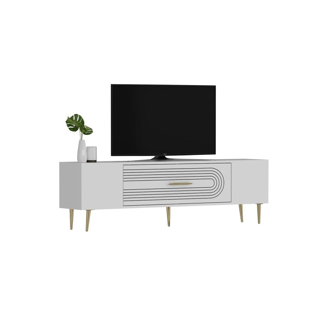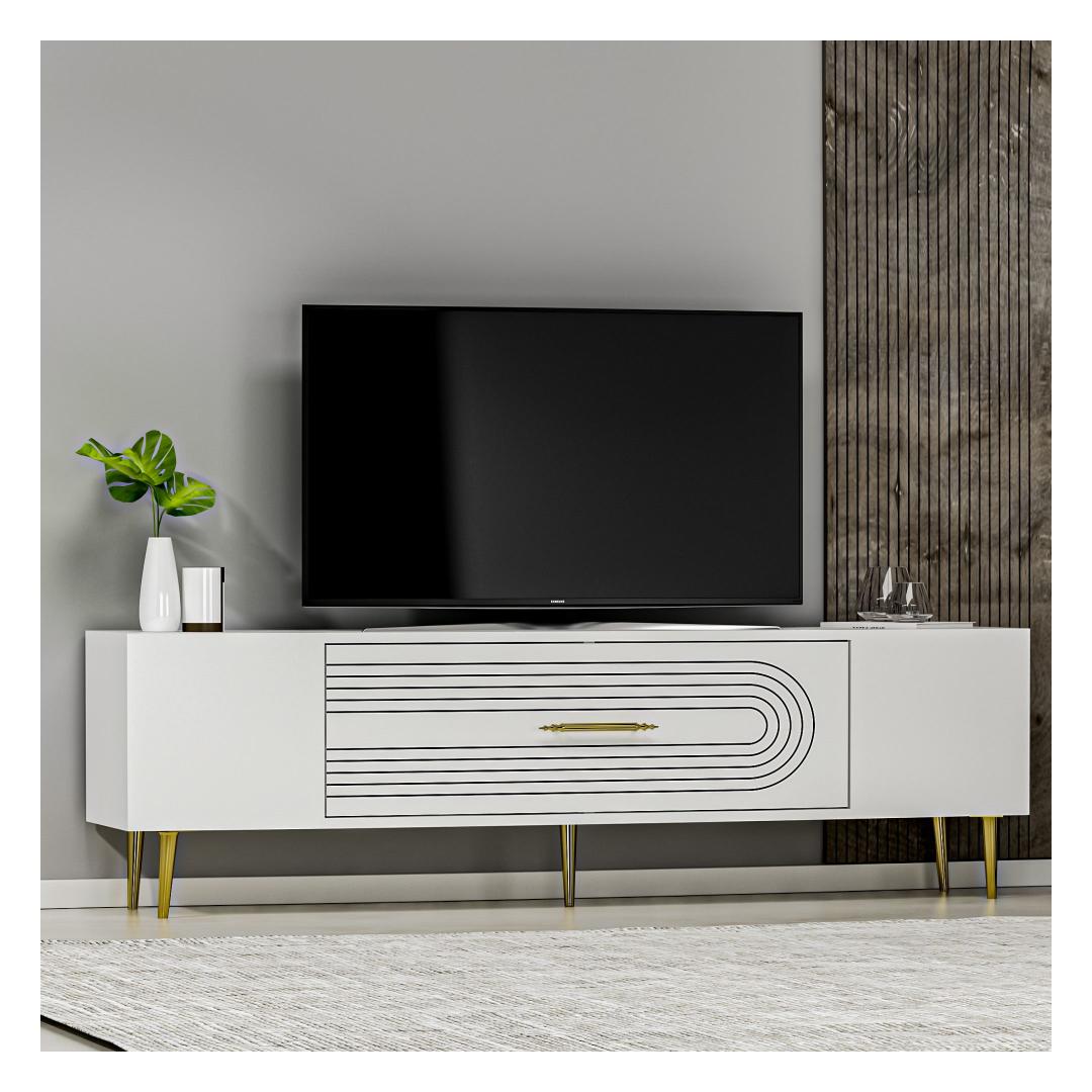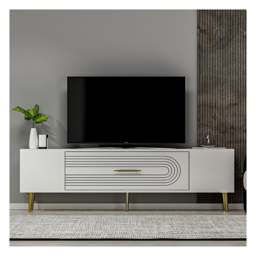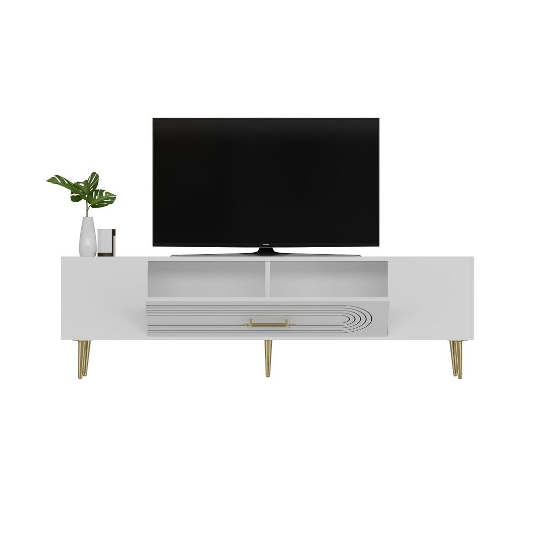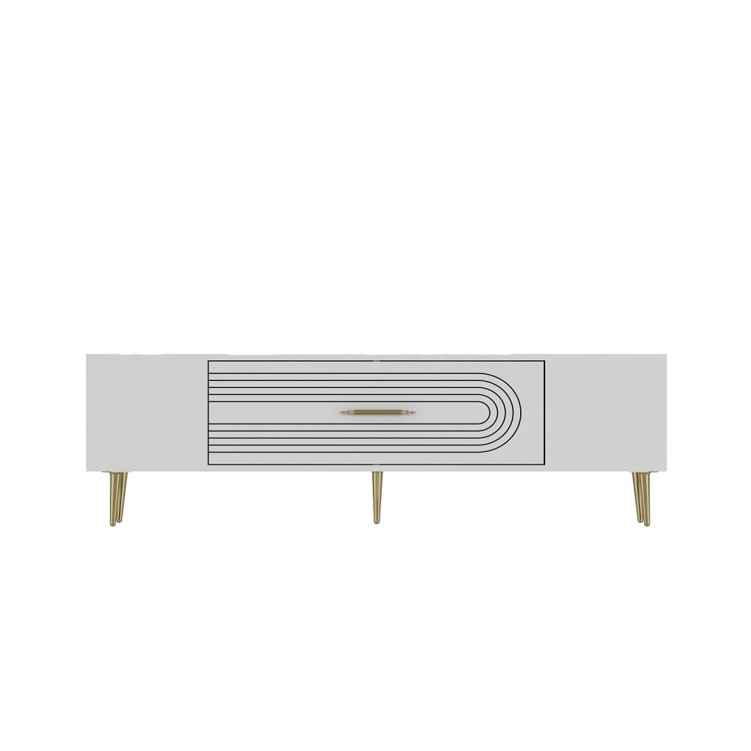 Transform your living room into a luxurious and elegant space with our stunning TV stand. Crafted from 100% melamine coated particle board, this TV stand is not only durable but also incredibly stylish. The sleek white and gold color combination adds a touch of sophistication to any room, making it the perfect centerpiece for your entertainment area.