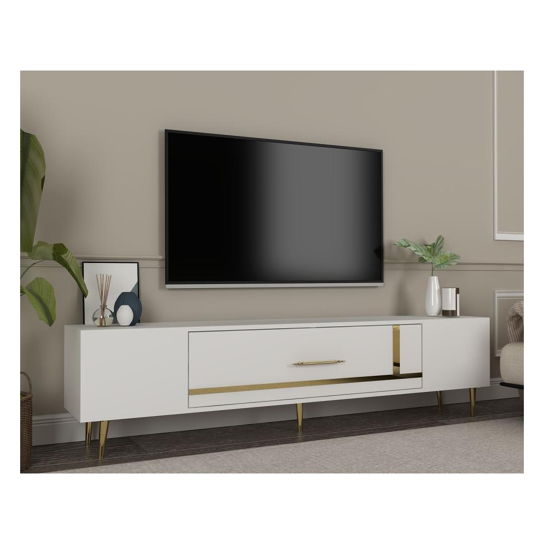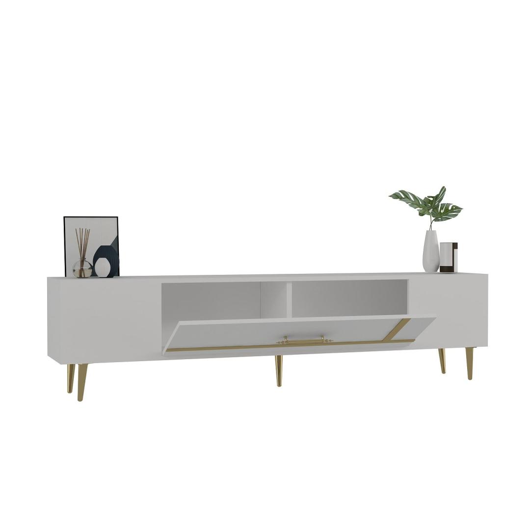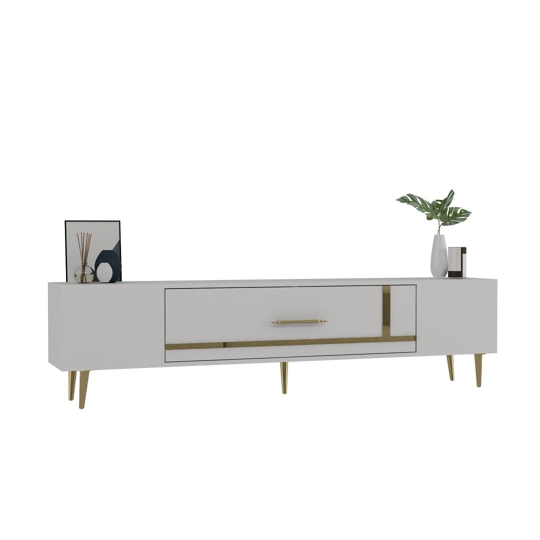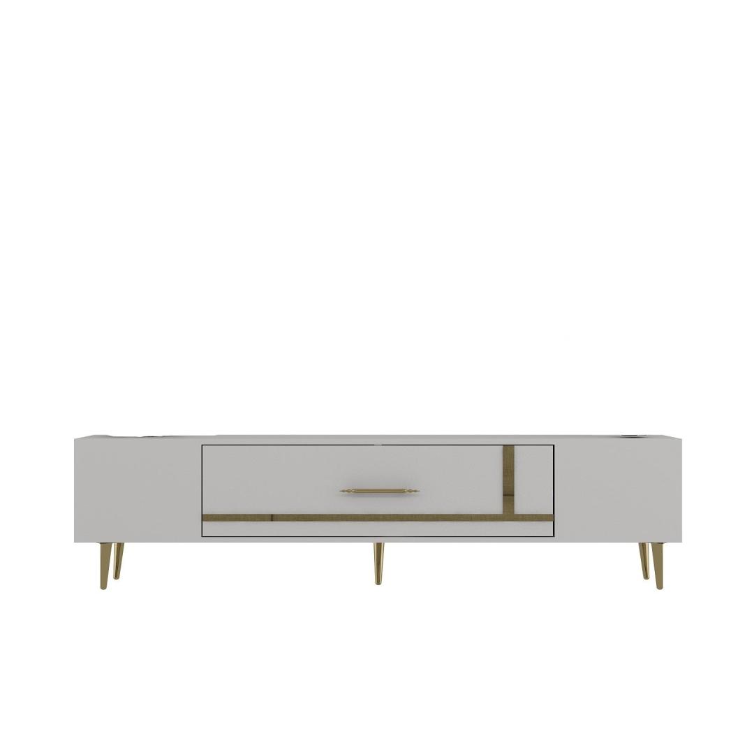 Transform your living room into a luxurious and elegant space with our stunning TV stand. Crafted from 100% melamine coated particle board, this TV stand is not only durable but also incredibly stylish. The sleek white and gold color combination adds a touch of sophistication to any room, making it the perfect centerpiece for your entertainment area.