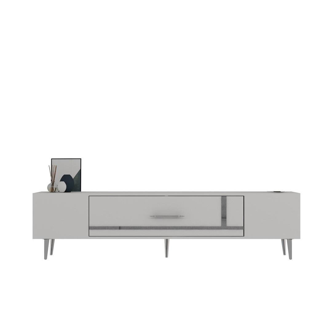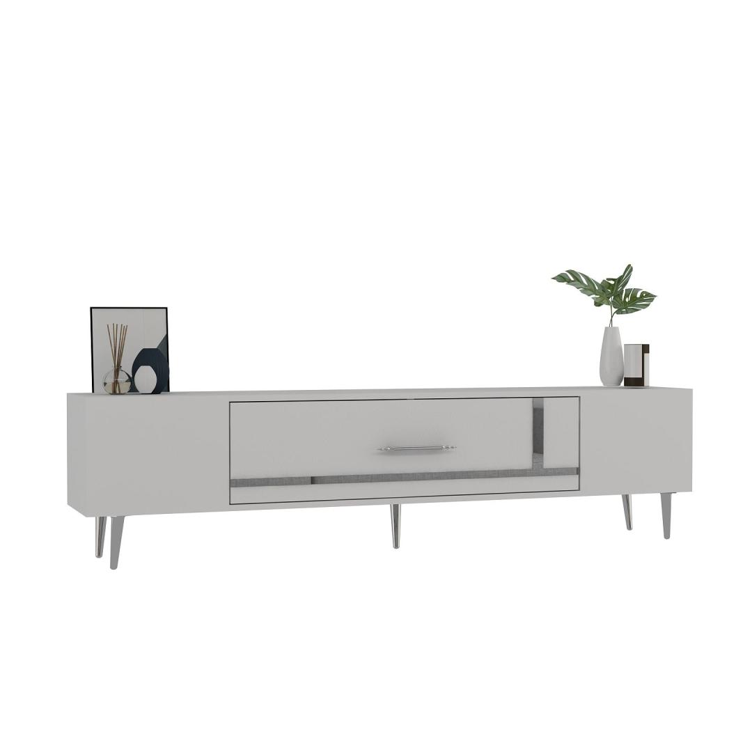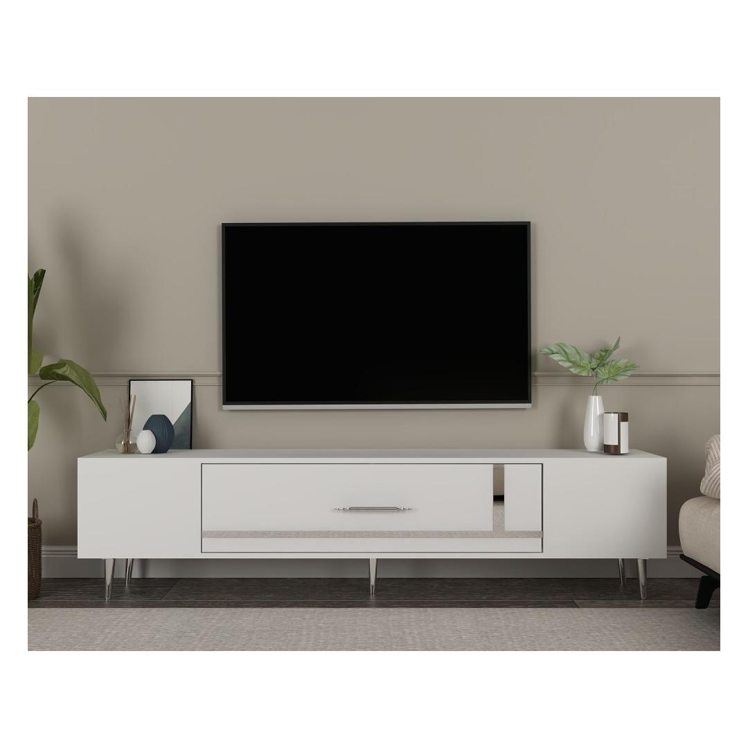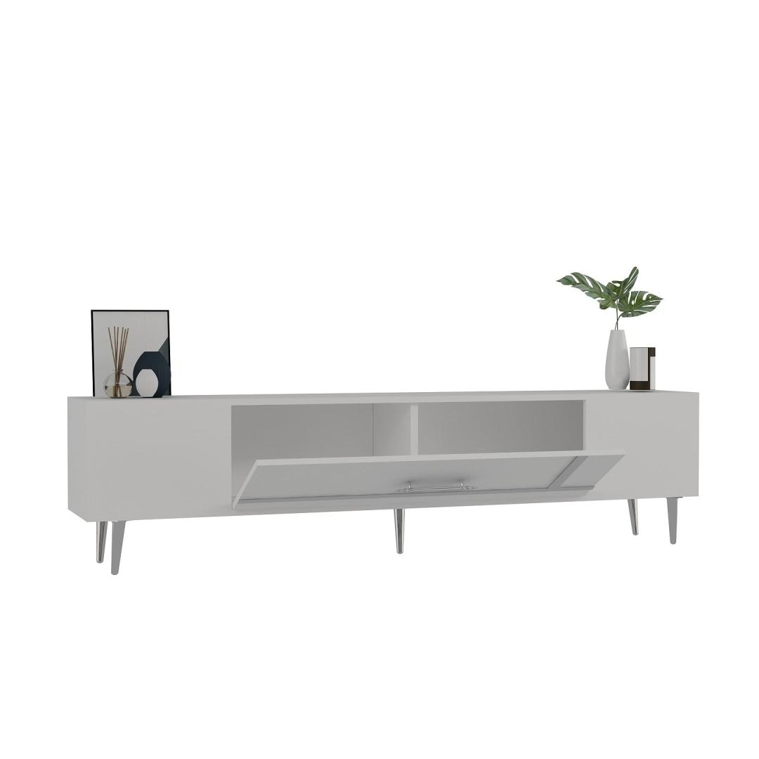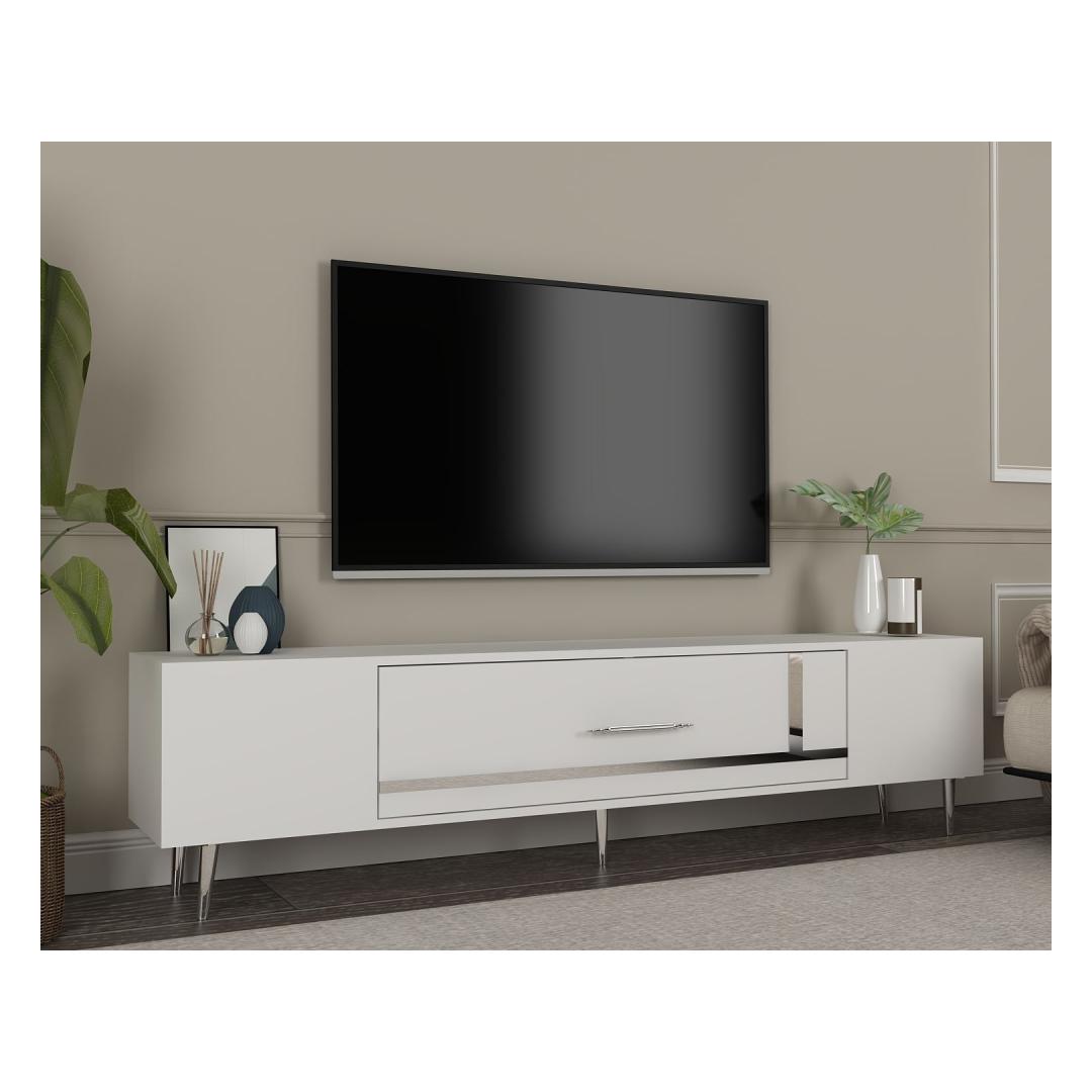 Transform your living room with our stunning TV stand, crafted from 100% melamine coated particle board for durability and style. The sleek design features a combination of white and silver colors, adding a modern touch to any space.