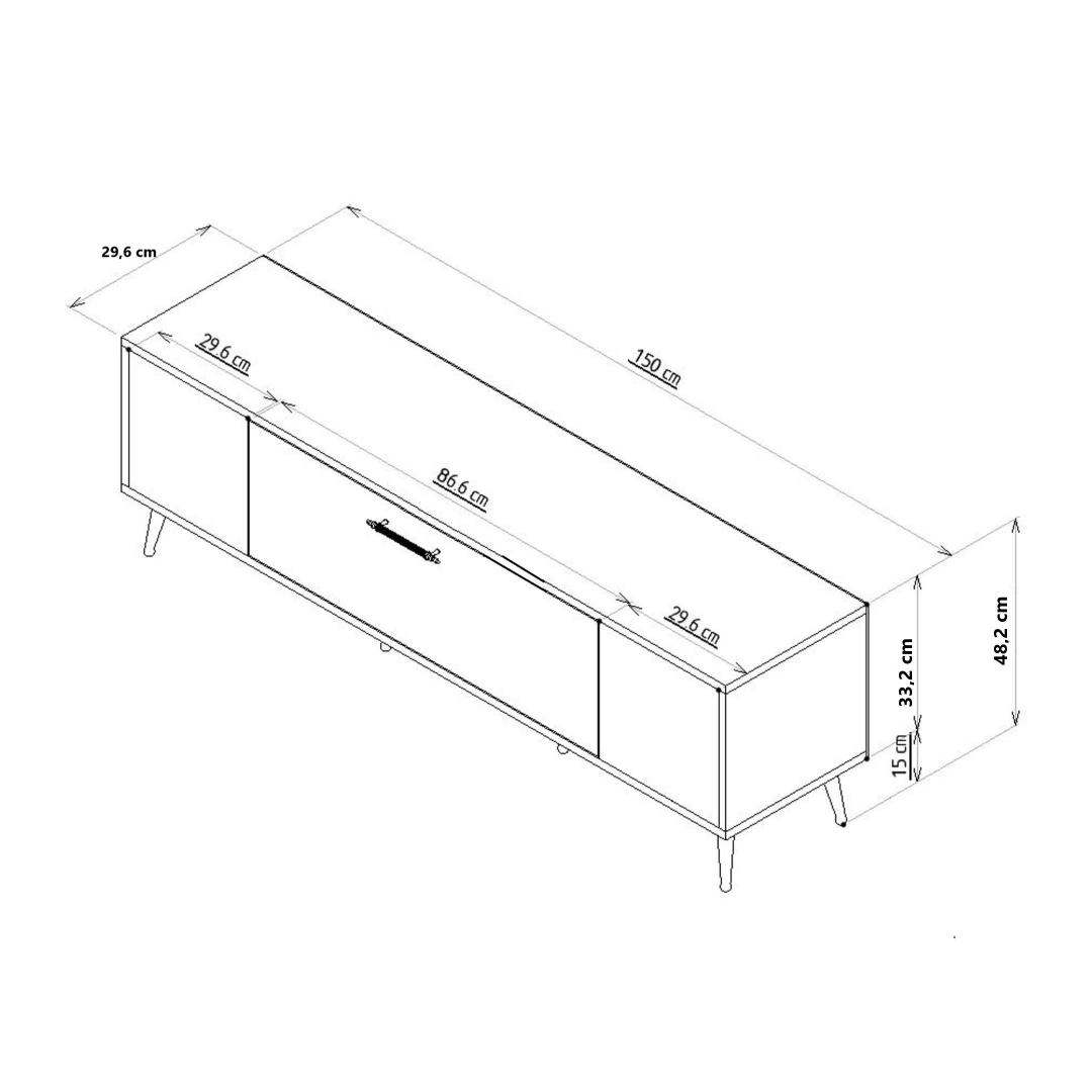 With a width of 150 cm, height of 48.2 cm, and depth of 29.6 cm, this TV stand offers ample storage space for your media devices and accessories. The 15 cm leg height adds a touch of sophistication while providing stability for your television.