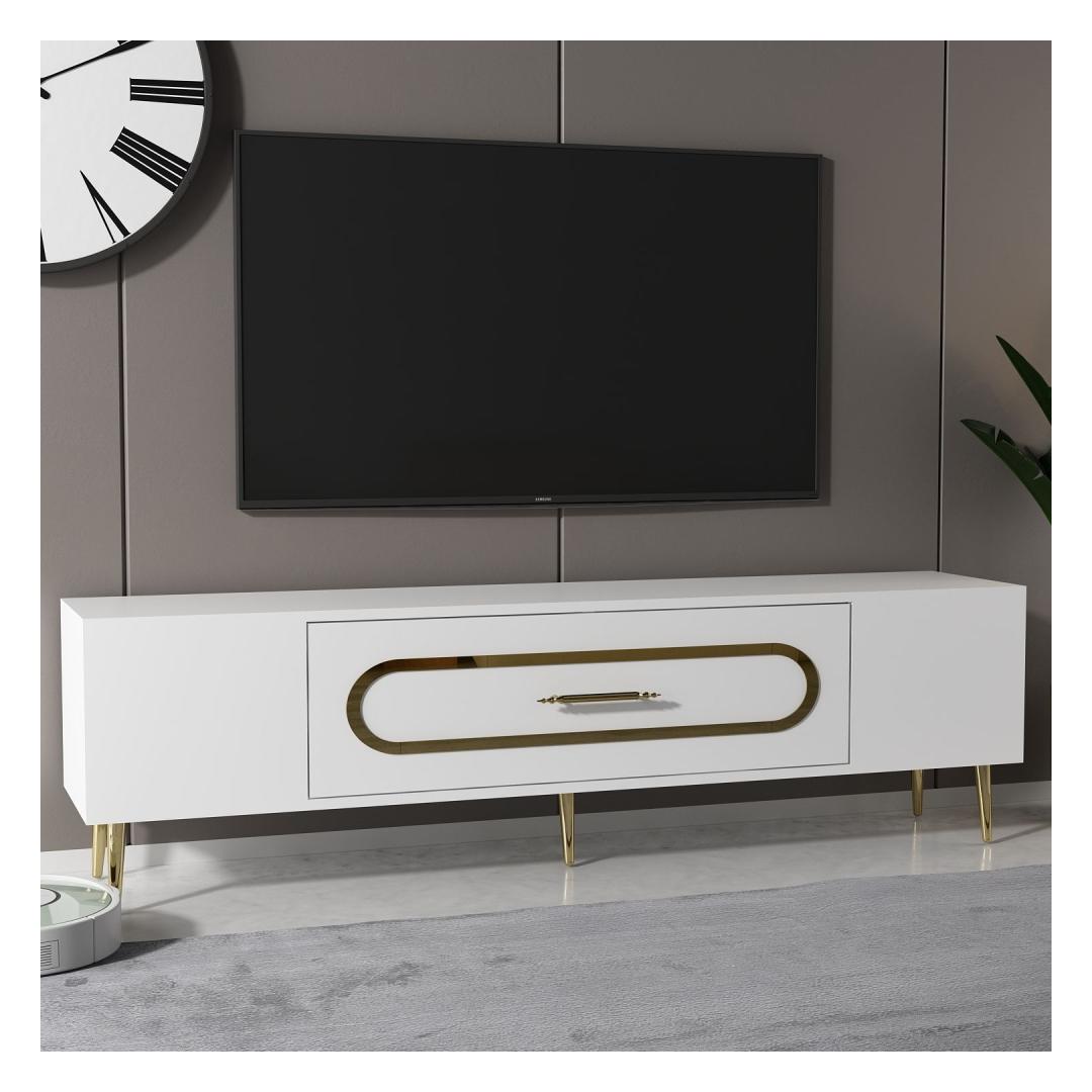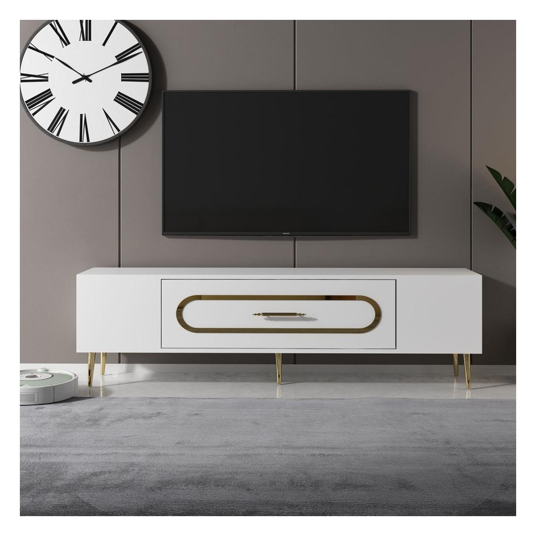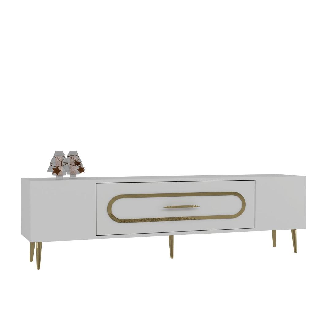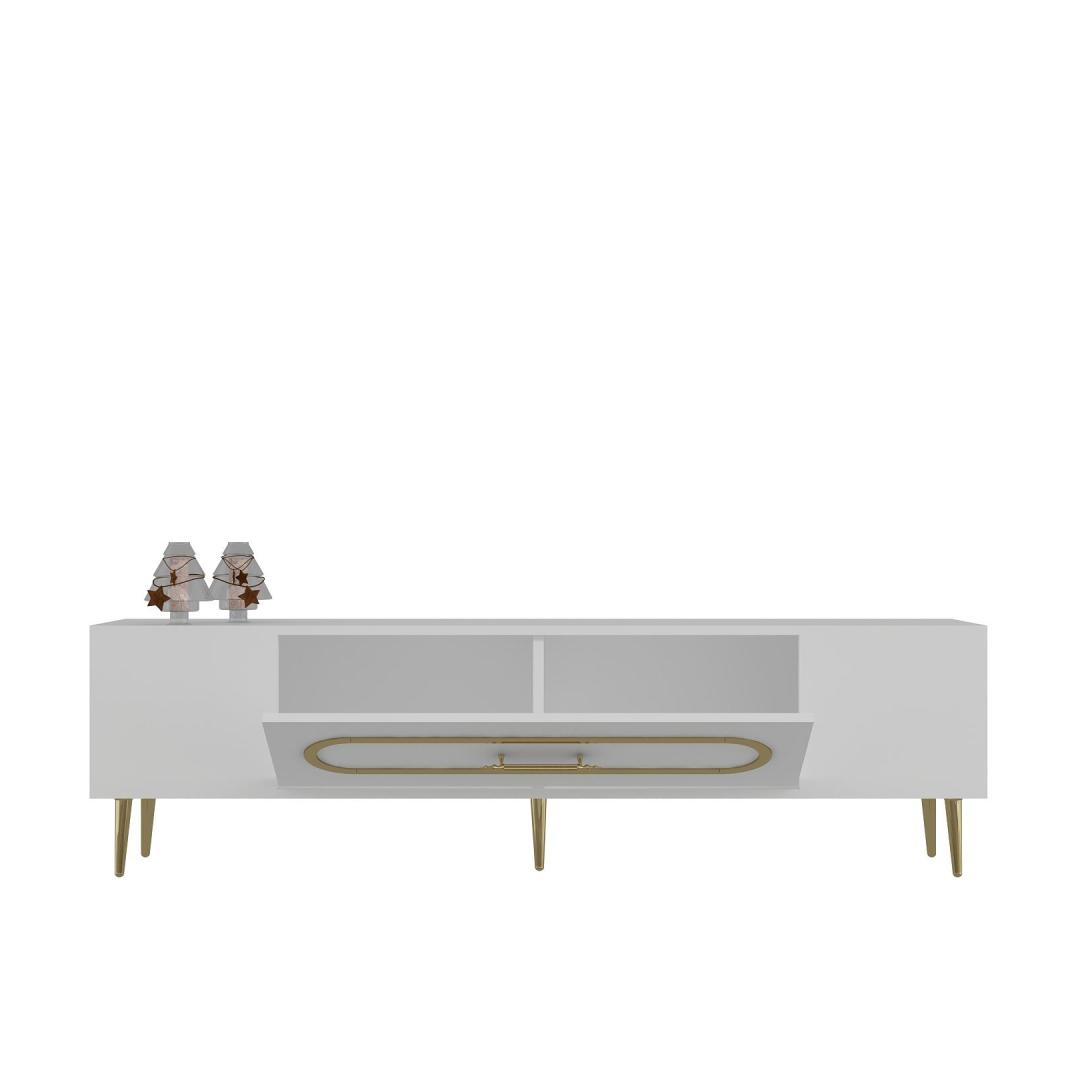 Transform your living room into a luxurious and elegant space with our stunning TV stand. Crafted from 100% melamine coated particle board, this TV stand is not only durable but also incredibly stylish. The sleek white and gold color combination adds a touch of sophistication to any room, making it the perfect centerpiece for your entertainment area.