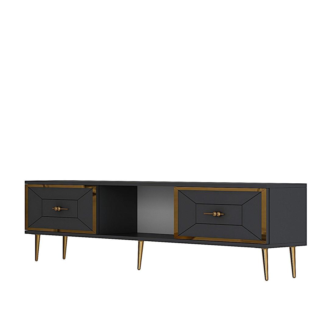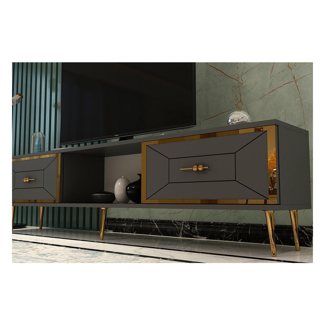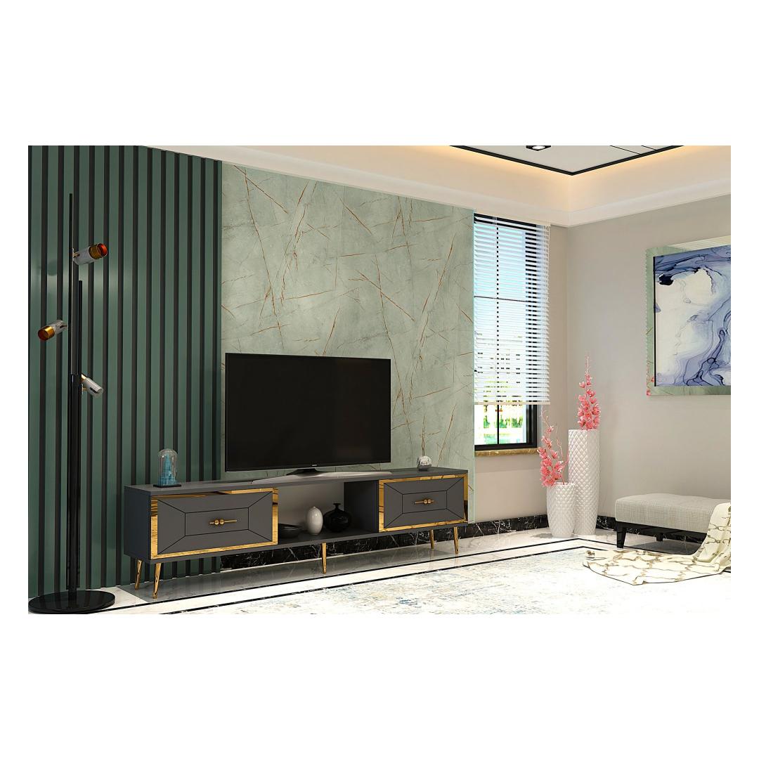 Transform your living room into a stylish and sophisticated space with our stunning TV stand. Made from 100% melamine coated particle board, this TV stand is not only durable but also incredibly elegant. The sleek design in Anthracite and Gold colors will instantly elevate the look of your entertainment area, making it the focal point of the room.