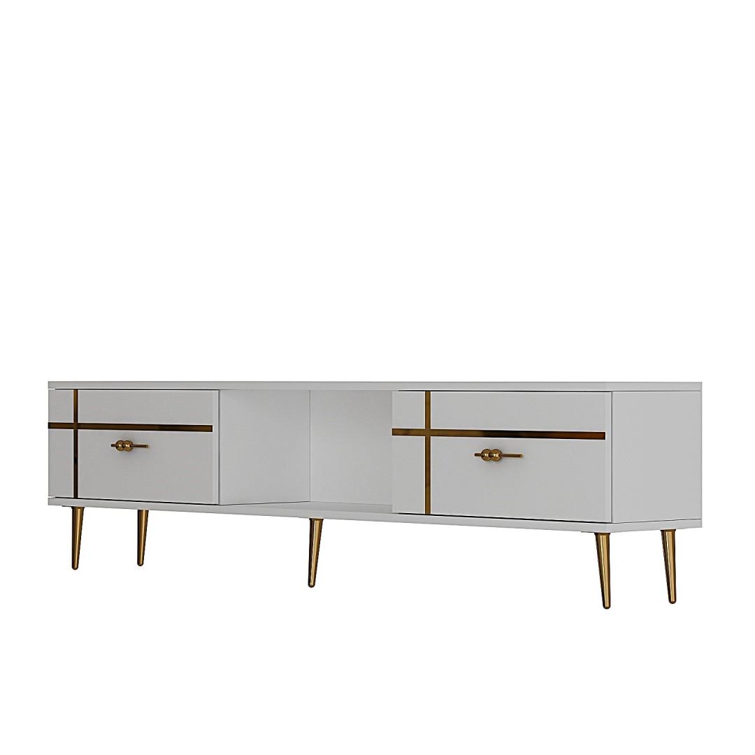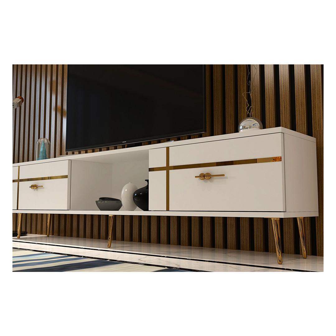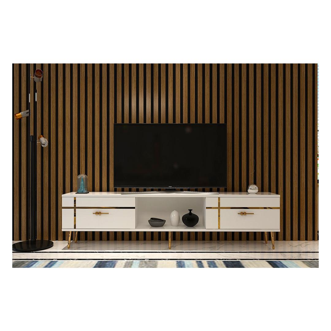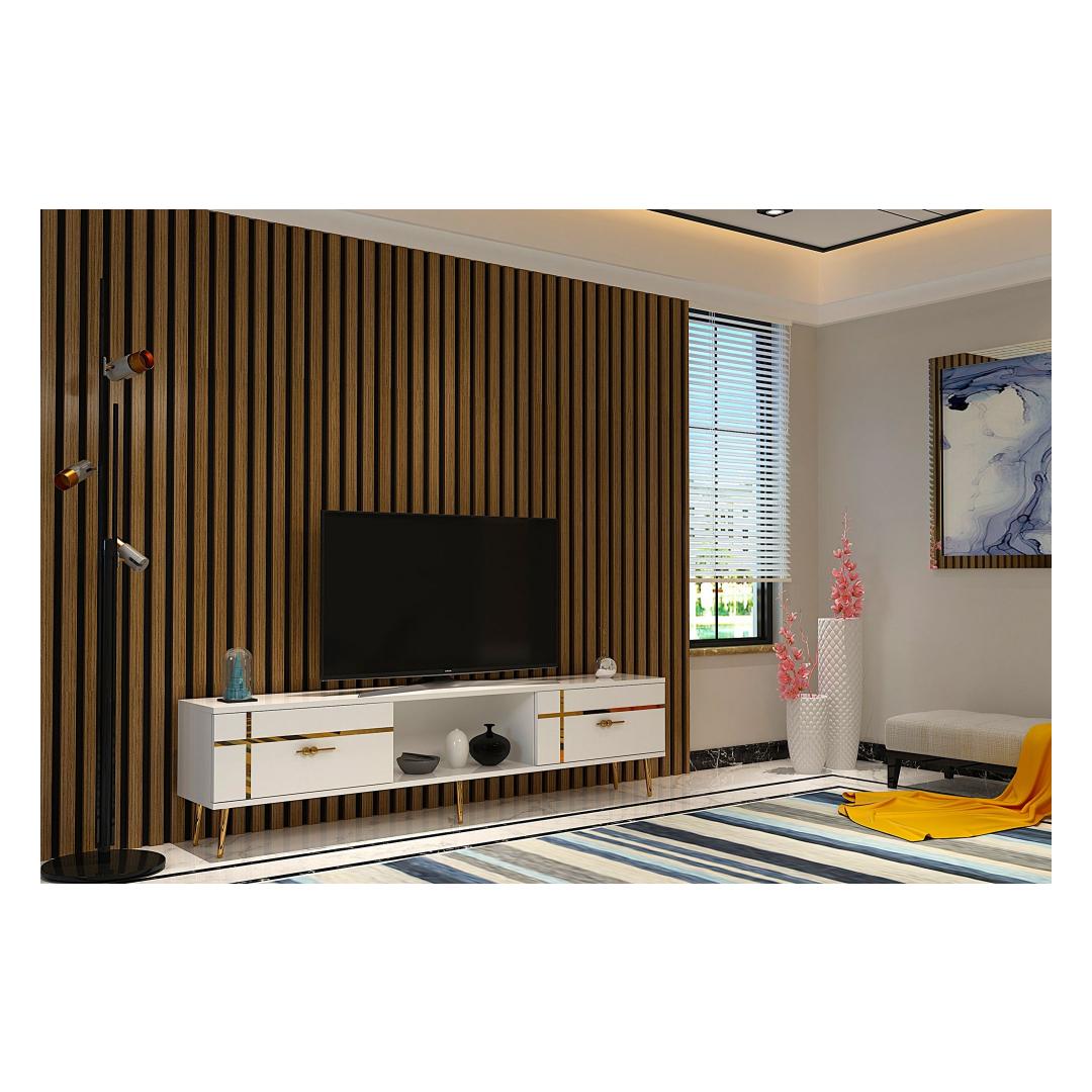 Transform your living space with our stunning TV stand, crafted from 100% melamine coated particle board. The sleek design and elegant combination of white and gold colors will instantly elevate the look of your room, adding a touch of luxury and sophistication.