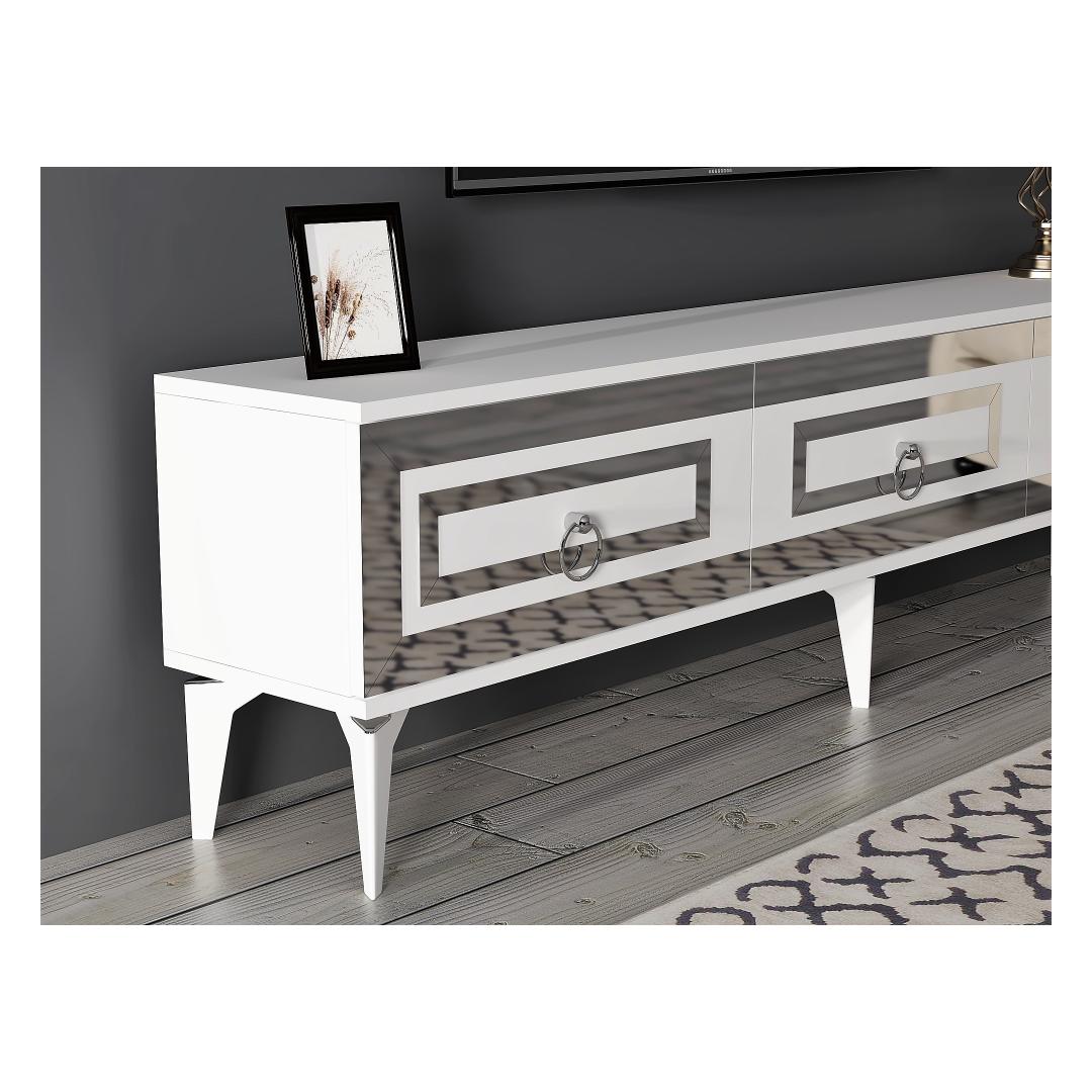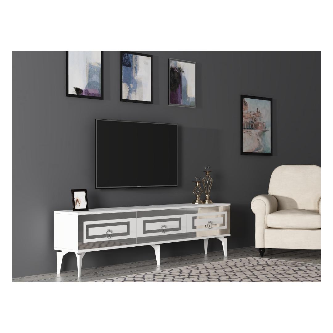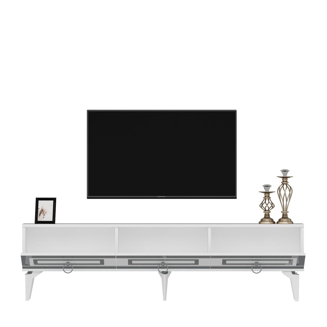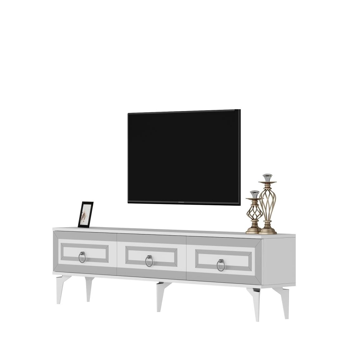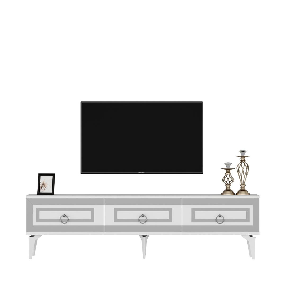 Crafted from 100% melamine coated particle board, this TV stand is built to last. The 18mm thickness ensures durability and stability, while the white and silver color combination adds a touch of elegance to your home decor. With a width of 180cm, height of 29.6cm, and depth of 44.6cm, this TV stand provides ample storage space for all your media essentials.