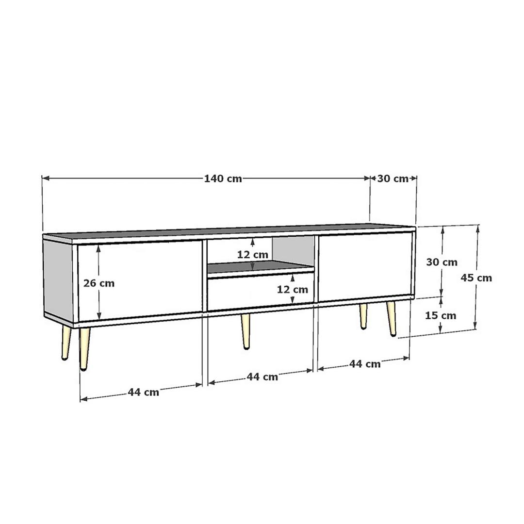 This TV stand is not only stylish but also versatile. It can be fixed to the wall for added stability and safety. The 18mm thickness of the particle board ensures that this stand can support even the largest of flat-screen TVs. The 140cm width provides ample space for your TV, while the 45cm height and 30cm depth offer plenty of storage options.