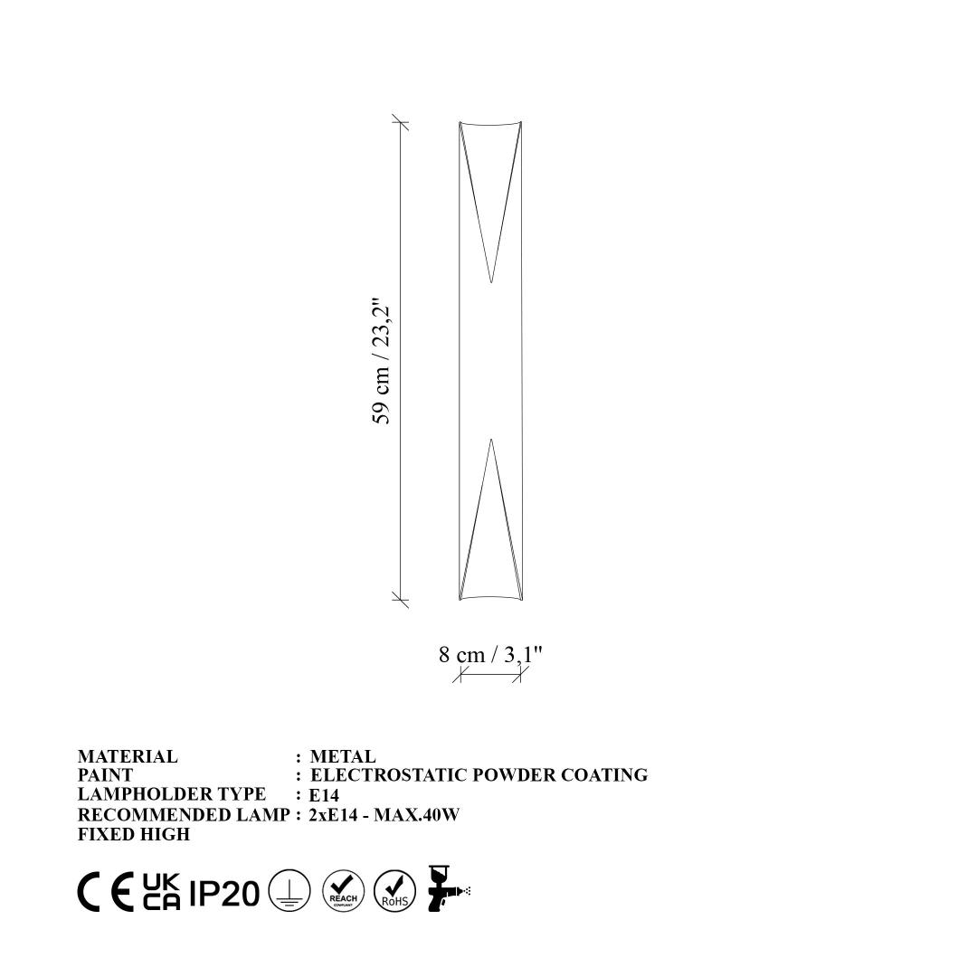 With a size of 8 x 59 x 12 cm and a base plate size of 8 x 20 x 3 cm, this wall lamp is easy to install and will fit seamlessly into your space. The 2 x E 14 sockets can accommodate bulbs up to 40W, giving you plenty of options to customize the lighting to your liking.
