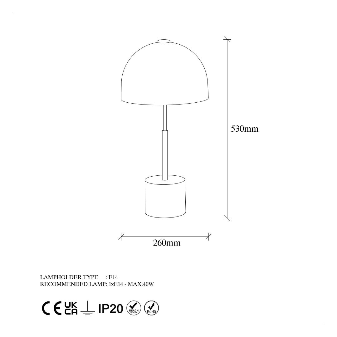 The metal cap of the lamp is beautifully crafted, with a diameter of 26 cm and a height of 18 cm, adding a unique touch to the overall design. The lamp stands at a size of 26 x 26 x 53 cm, making it the perfect size for any side table or nightstand. The base plate has a diameter of 13 cm and a height of 10 cm, providing stability and support to the lamp.