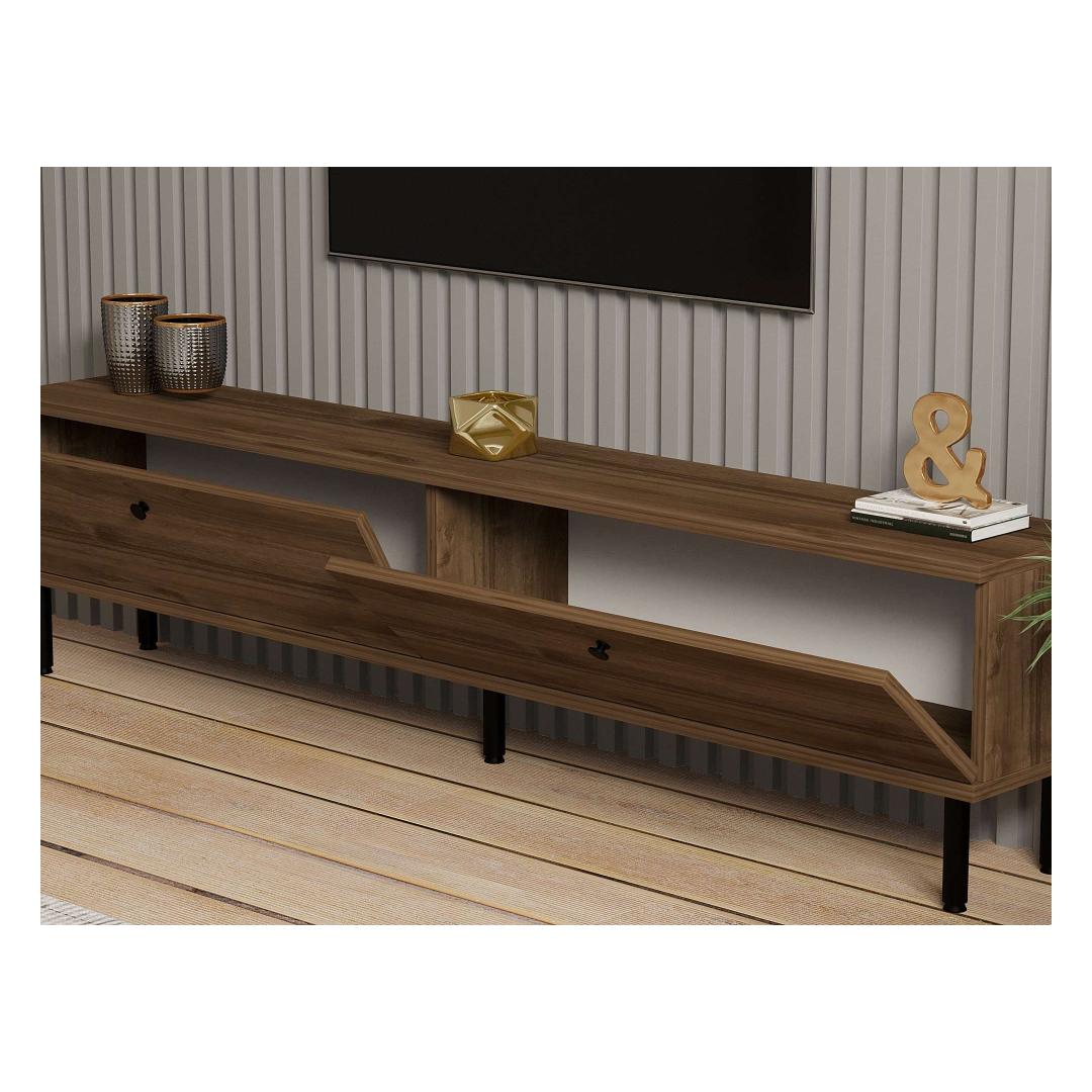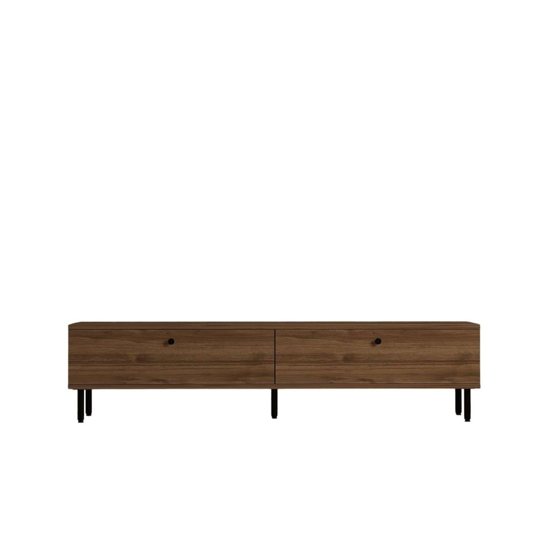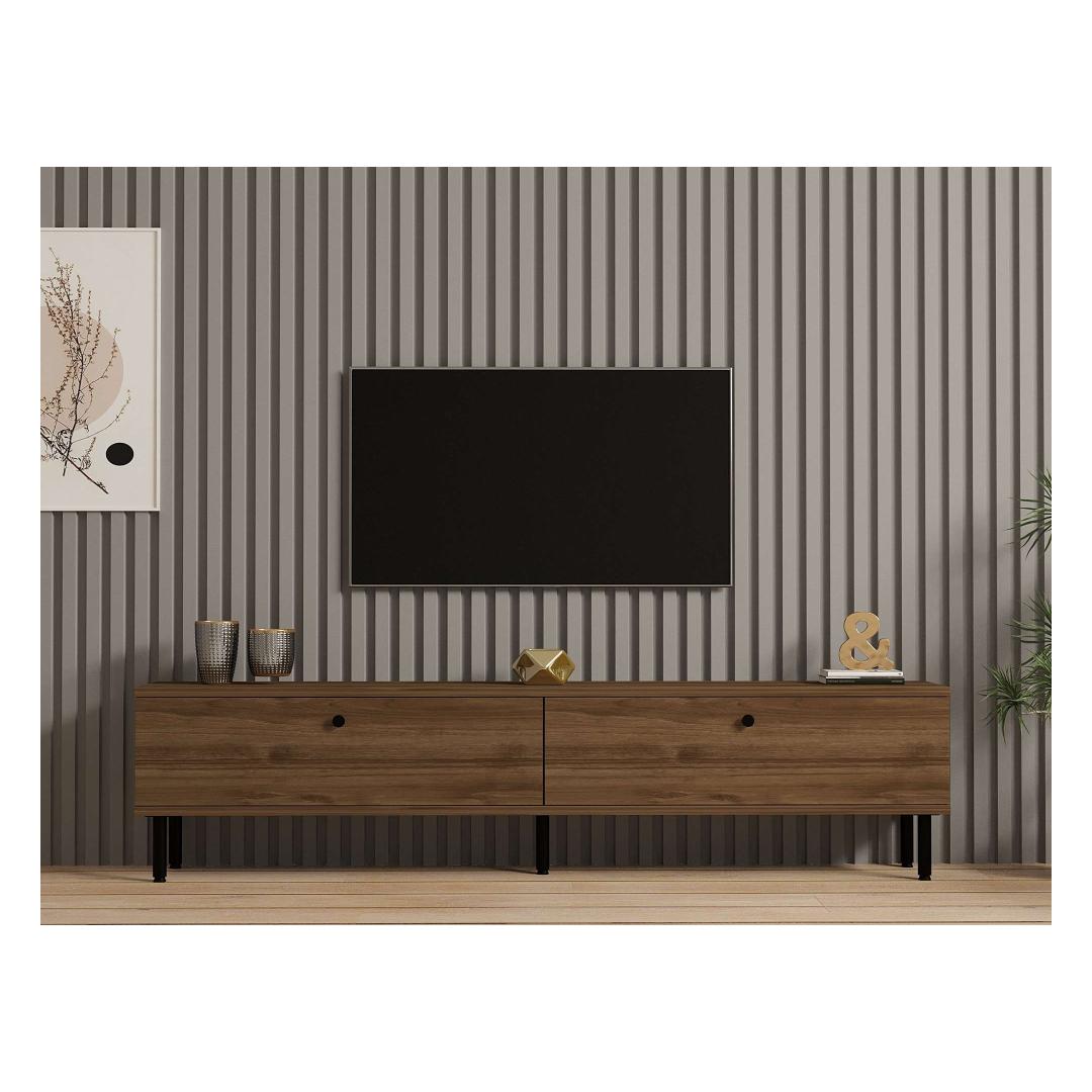 Our TV stand is crafted from 100% melamine coated particle board, ensuring durability and longevity. The sleek walnut color adds a touch of sophistication to any room, while the metal legs provide stability and support. With a width of 160 cm, height of 37 cm, and depth of 25 cm, this stand is the perfect size for most living rooms or bedrooms.