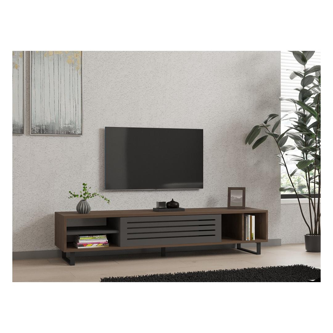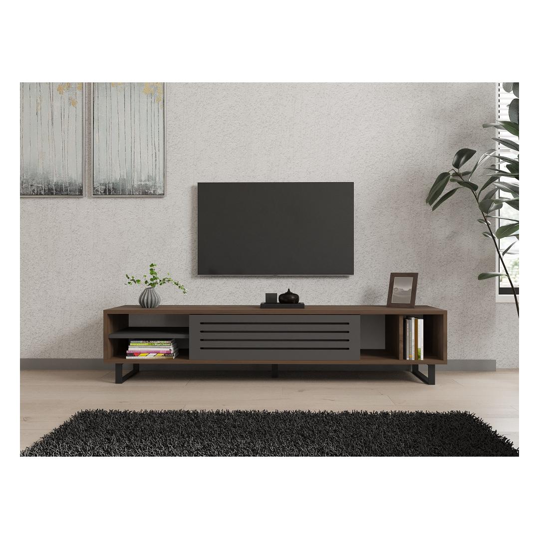 Designed with an industrial concept in mind, this TV stand effortlessly blends modern aesthetics with timeless charm. The combination of walnut and anthracite colors adds a touch of sophistication to any room, making it the perfect centerpiece for your entertainment area.