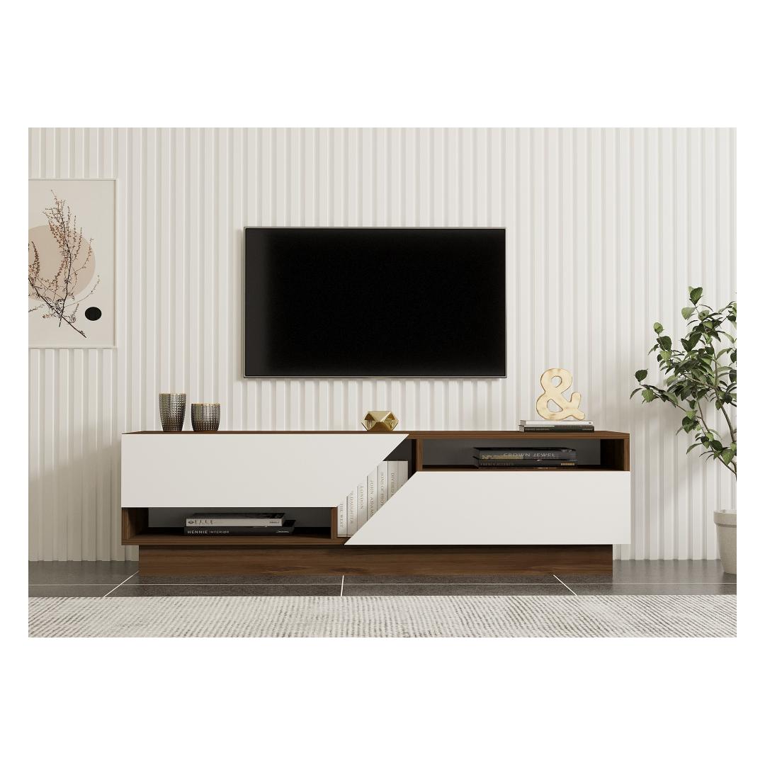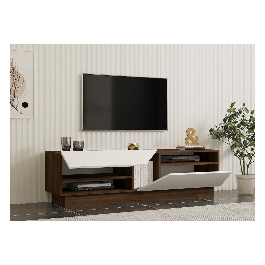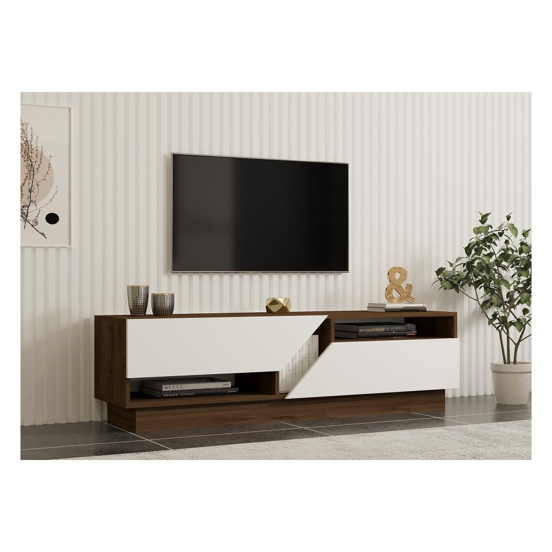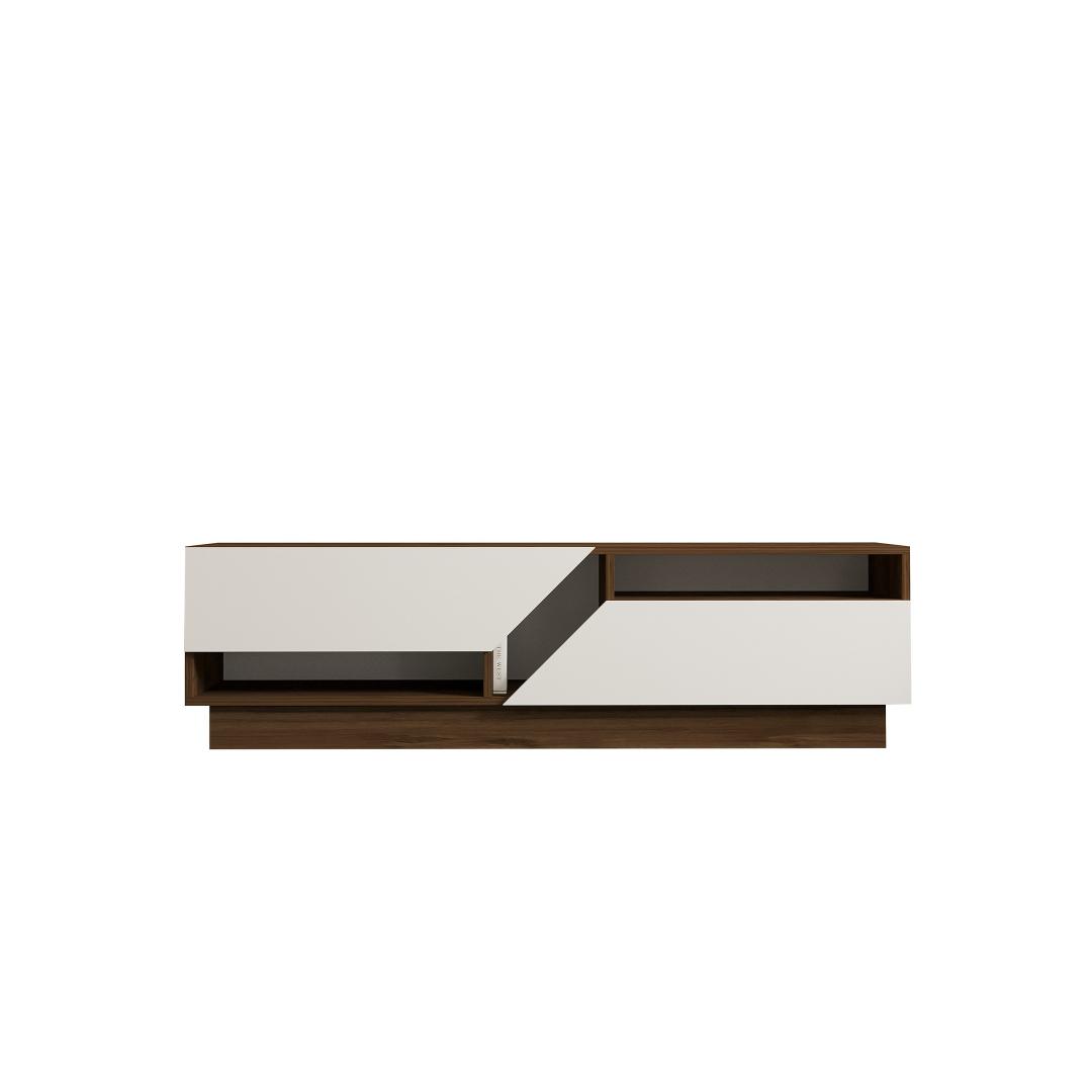 Crafted from 100% melamine coated particle board, this TV stand is built to last. The 18mm thickness ensures sturdiness and stability, allowing you to confidently display your television and other media devices. The walnut and white color combination adds a touch of elegance and sophistication to any room, making it a versatile choice for any interior design.