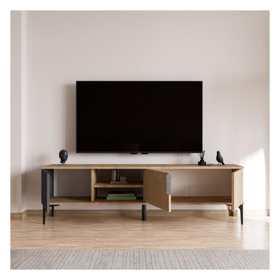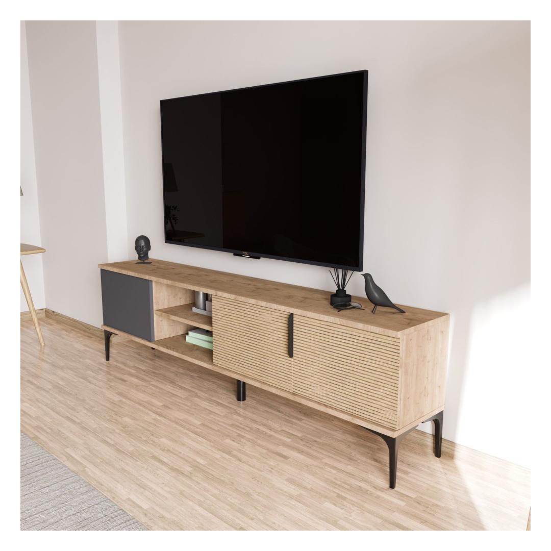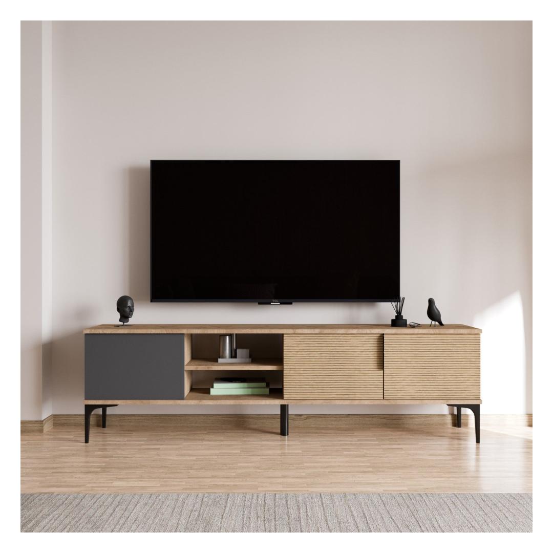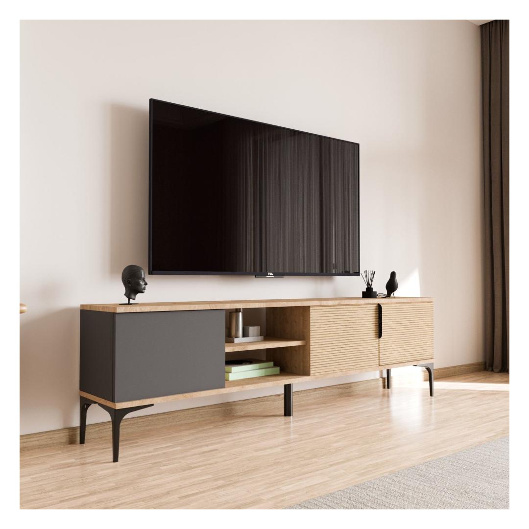 With its modern design and versatile color combination of anthracite and oak, this TV stand will instantly elevate the look of your living space. The clean lines and ample storage space make it the perfect addition to any home.