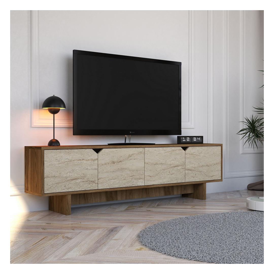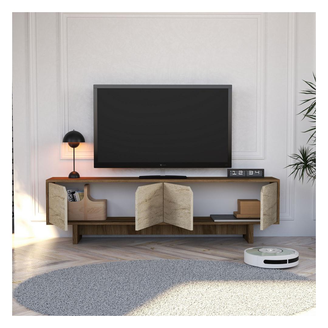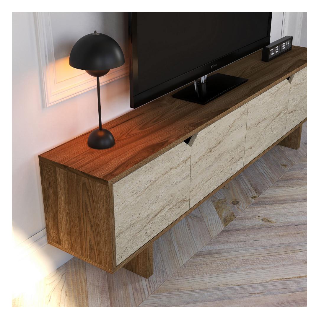 The walnut and travertine colors of this TV stand add a touch of elegance to any room, while the option to fix it to the wall ensures stability and safety. Whether you're hosting a movie night with friends or enjoying a quiet evening at home, this TV stand will be the focal point of your living room.