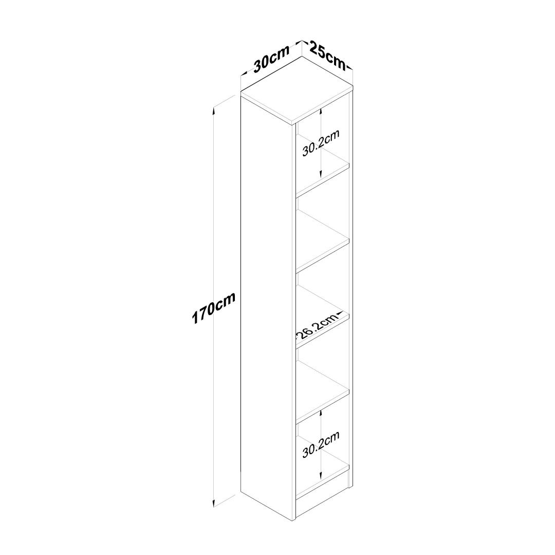 With a thickness of 18 mm, this bookshelf is not only sturdy but also provides ample storage space for all your belongings. The width of 30 cm allows you to neatly arrange your books, while the height of 170 cm ensures that you can showcase your favorite items without any limitations. The depth of 25 cm is perfect for displaying larger items or storing boxes and files.