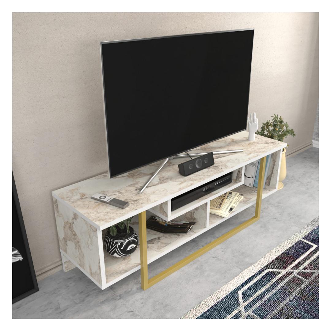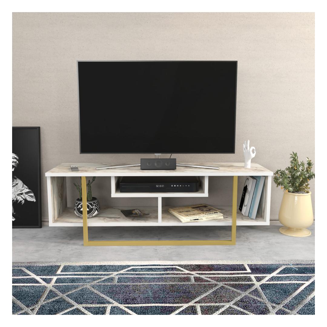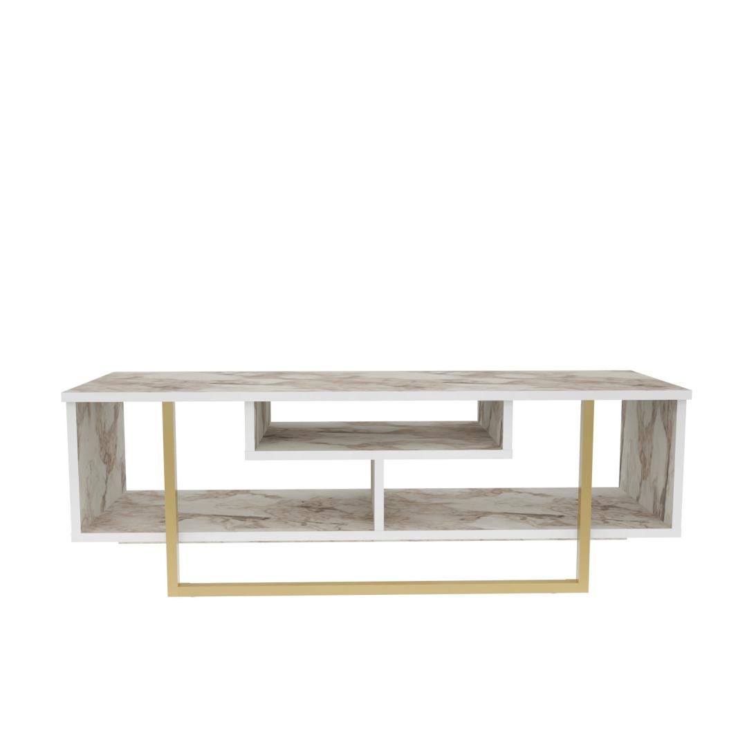 The TV stand features a captivating combination of white and gold colors, adding a touch of opulence to your living space. The sleek white finish creates a modern and sophisticated look, while the gold accents provide a glamorous and luxurious feel.