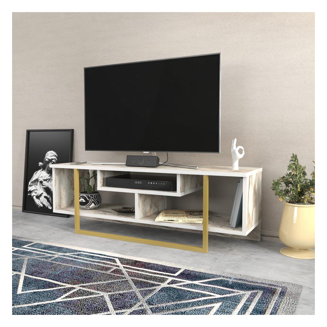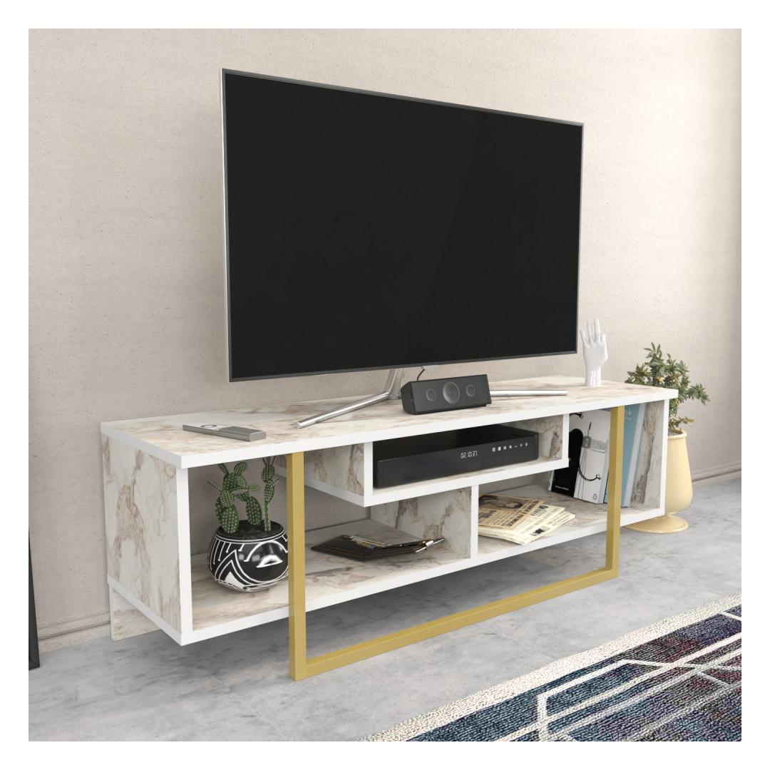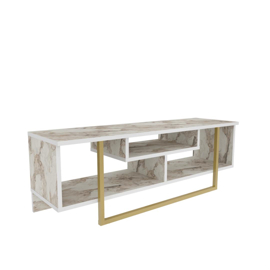 The TV stand features a captivating combination of white and gold colors, adding a touch of opulence to your living space. The sleek white finish creates a modern and sophisticated look, while the gold accents provide a glamorous and luxurious feel.
