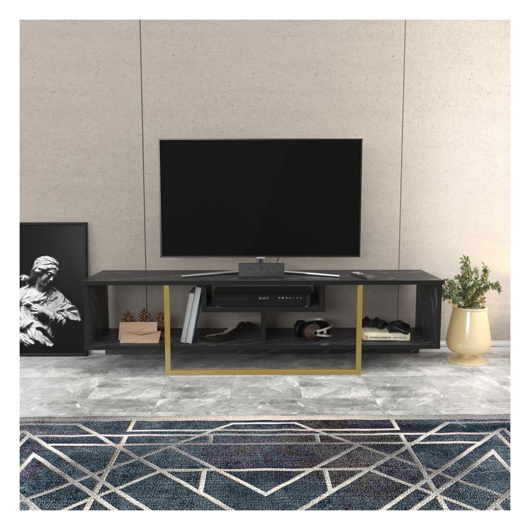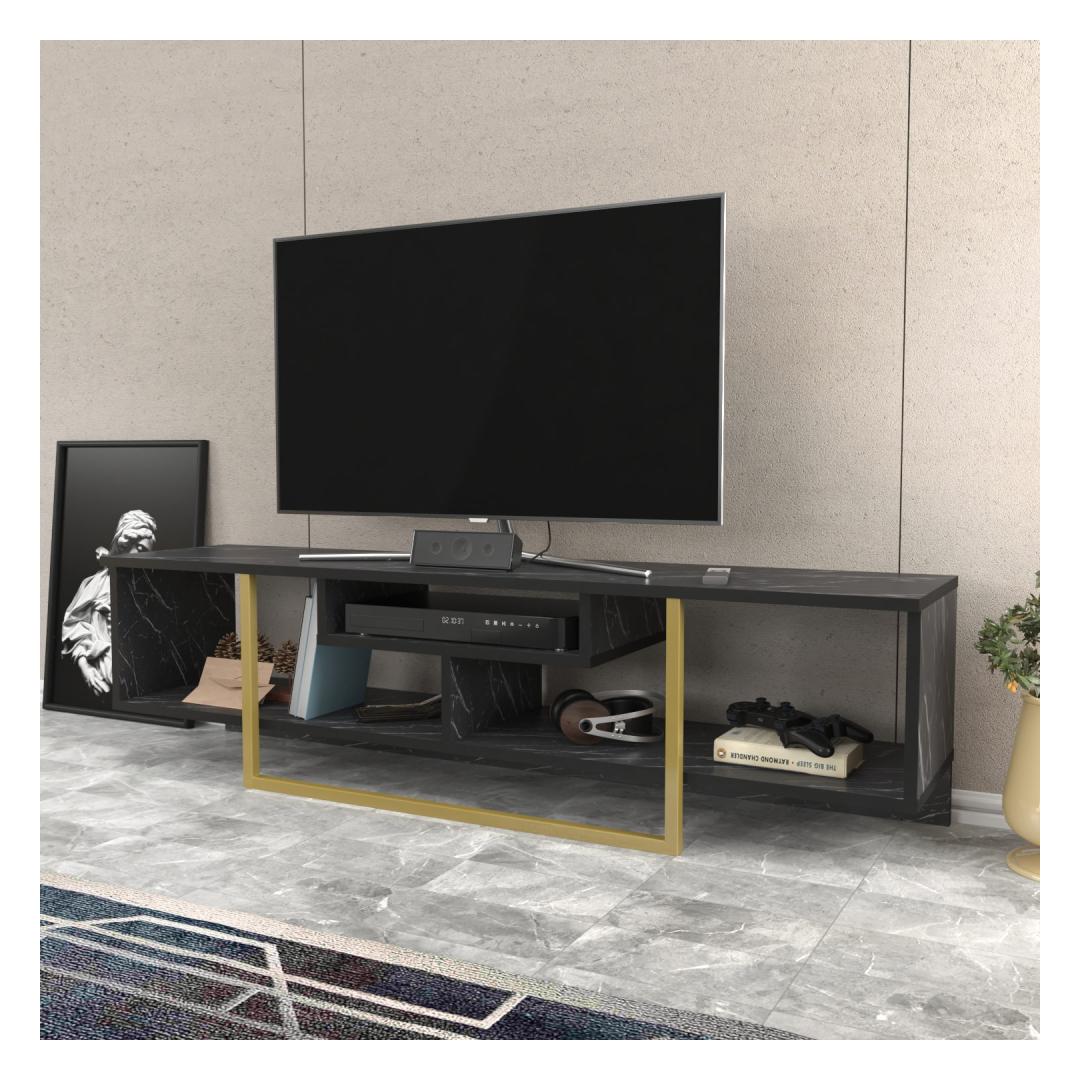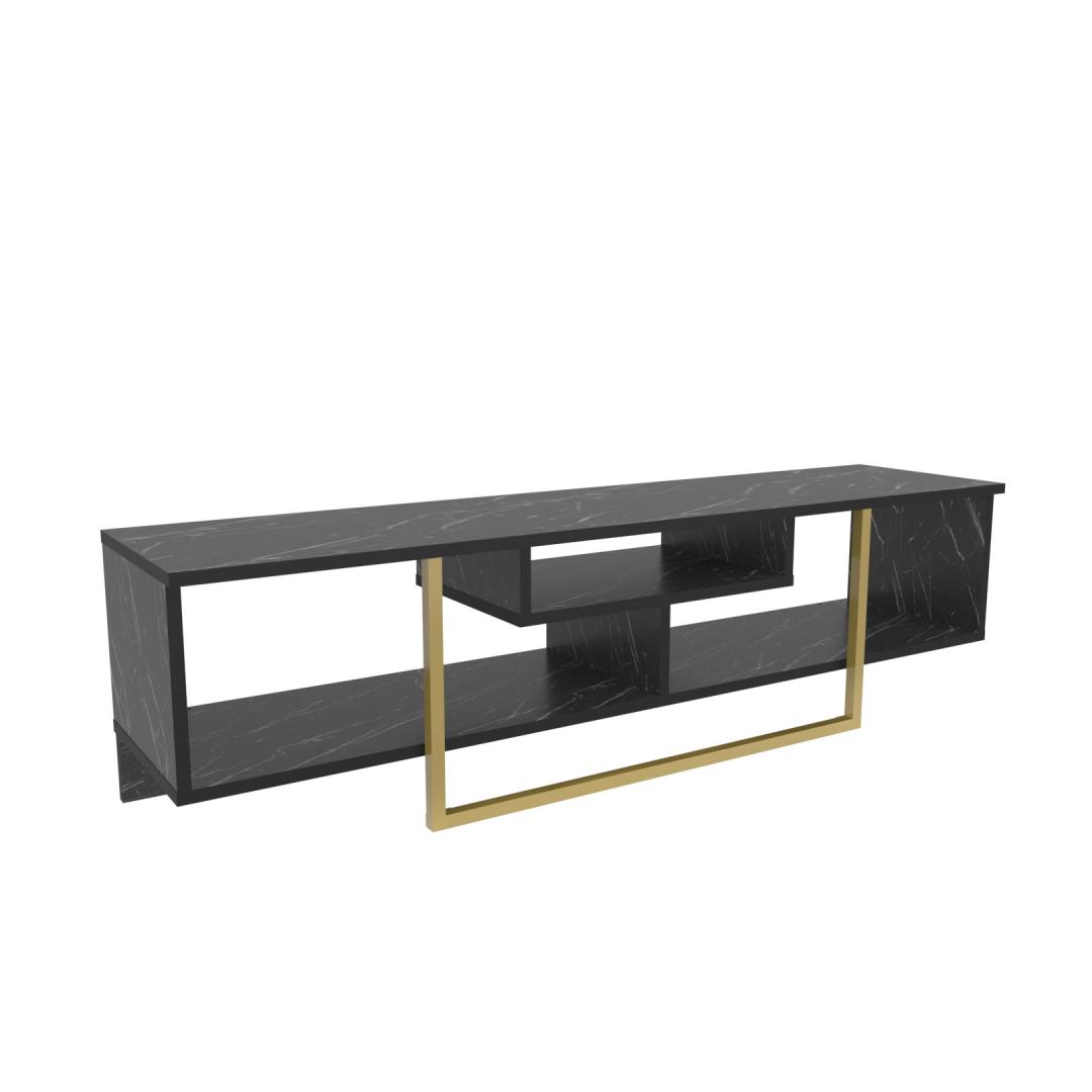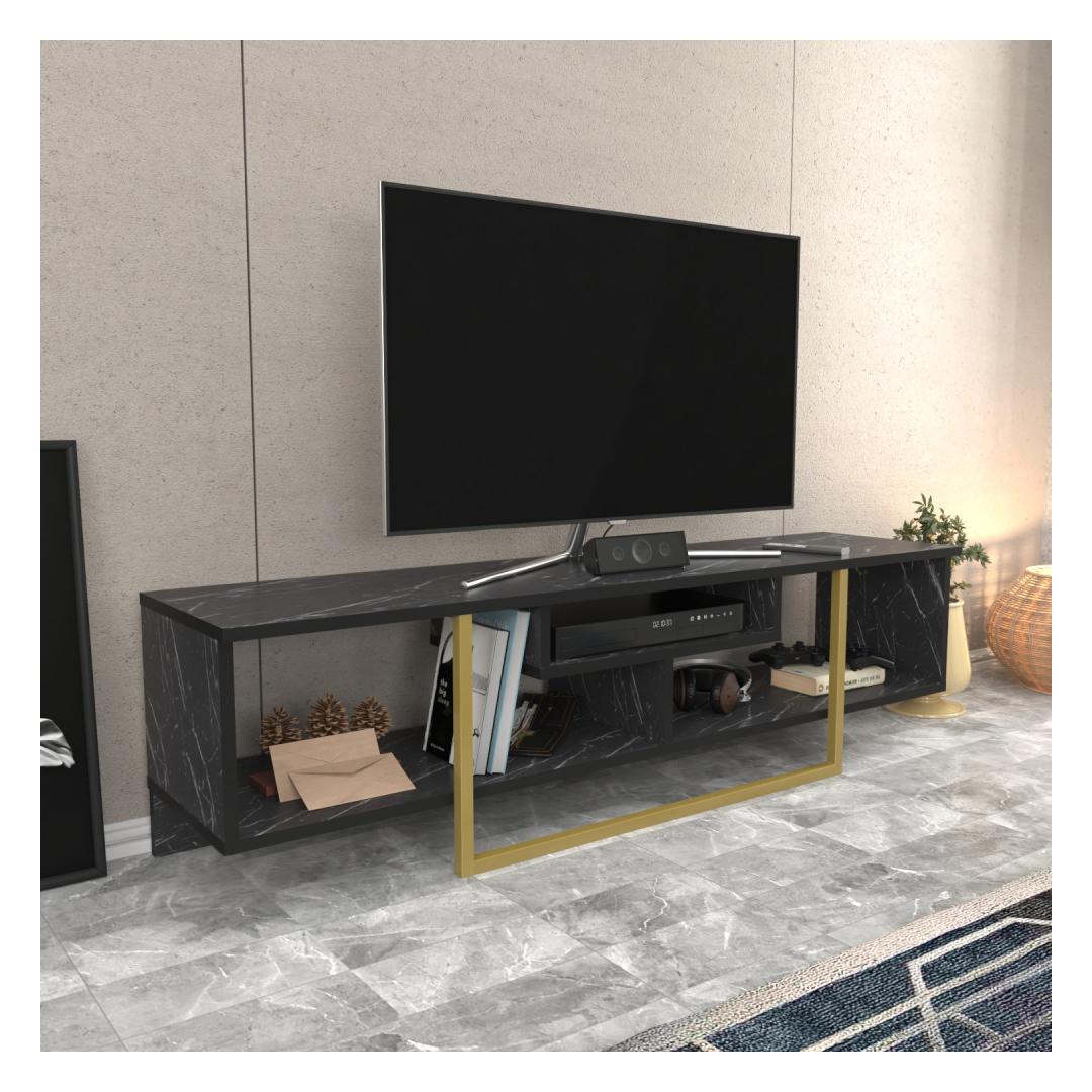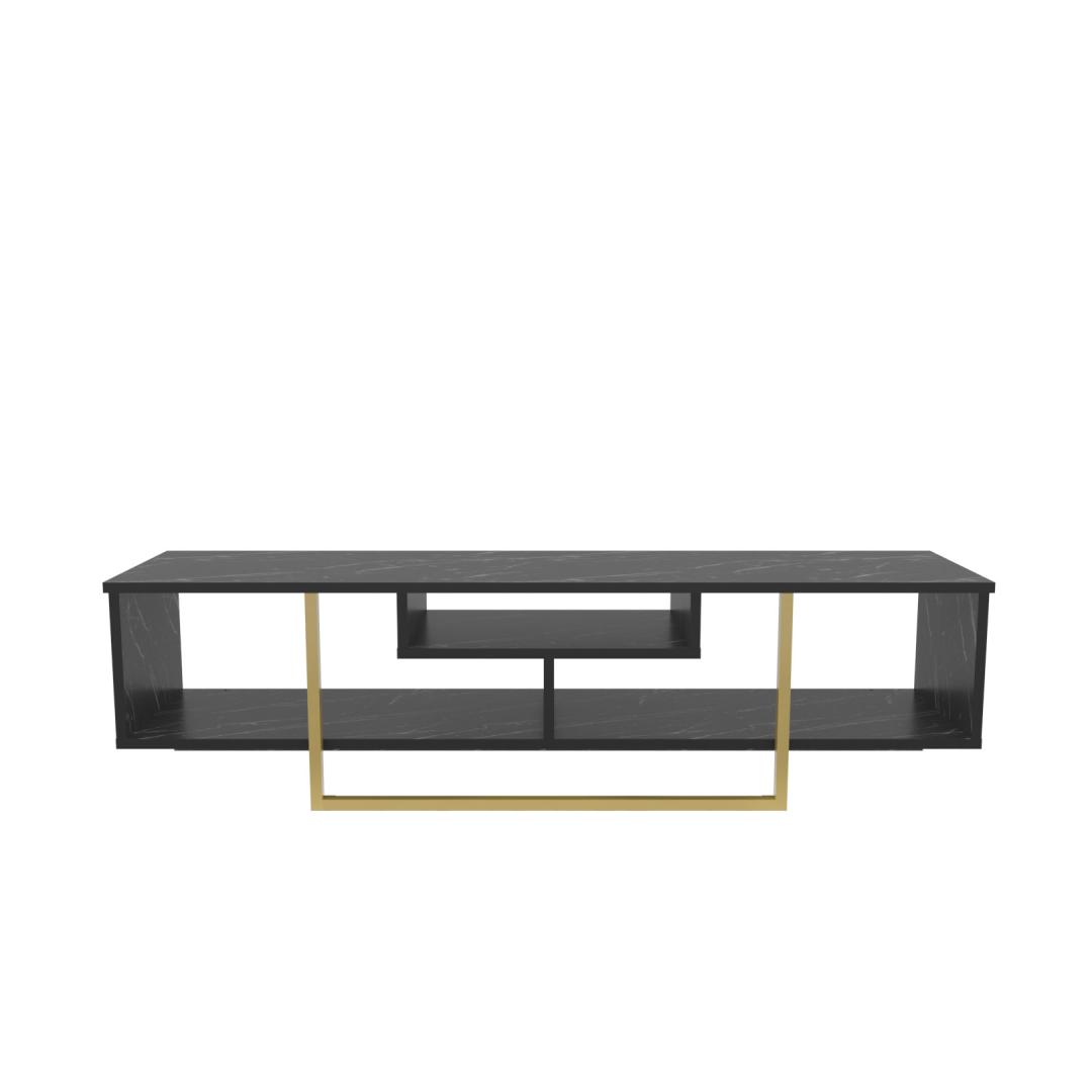 The combination of black and gold colors creates a striking visual contrast, adding a touch of luxury and refinement to your home decor. The sleek black finish is complemented by the elegant gold accents, making this TV stand a true statement piece.