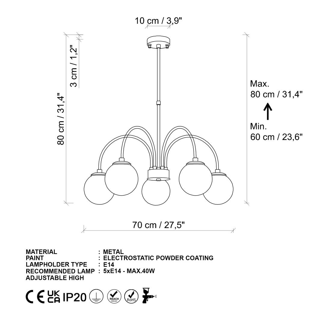 The chandelier comes with a base plate size of Ø10 h:2 cm, making it easy to install in any room. The socket type is 5 x E 14 Max 40 W, and the bulb is not included, allowing you to choose the perfect bulbs for your space.
