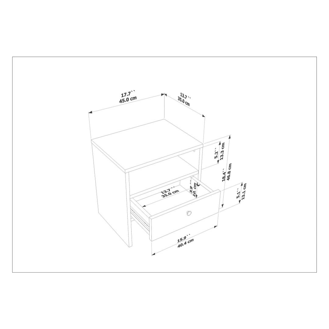 With a thickness of 18 mm, a width of 45 cm, height of 46.8 cm, and depth of 35 cm, this nightstand offers ample storage space for all your bedtime essentials. The spacious top surface is perfect for a lamp, books, or decorative items, while the drawer provides convenient storage for smaller items.