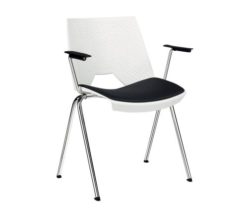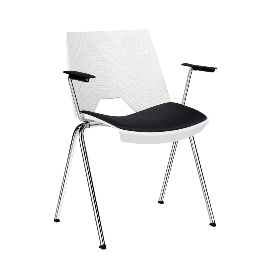 • 4 feet of steel tube Ø 19 mm, chromed. • Stackable 10 pcs. • Plastic seat available in 8 different colors: blue, gray, orange, black, red, beige, green, white. • Padded armrest and padded seat cushion. • The chairs can be connected to a hitch system. • 3 years warranty. • Made in the EU.