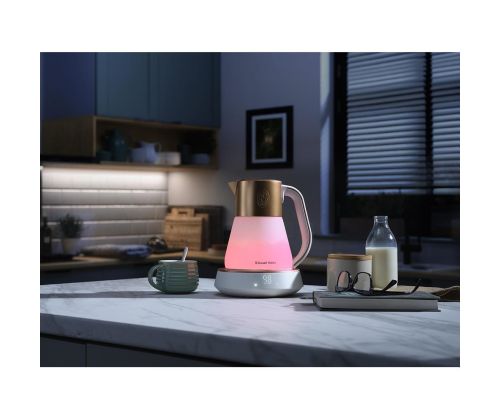 Стеклянный чайник Russell Hobbs Calm объемом 1,7 литра предлагает мягкую цветную подсветку и выбор успокаивающих звуков, создающих расслабляющую атмосферу.
