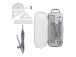 Металлическая линейка с максимальным радиусом 150 мм. В комплект входят линейка, два угольника, транспортир, ластик и точилка. Упаковка — пластиковая коробка с крючком для подвешивания.
