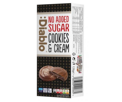 • Новое печенье Diablo в шоколадной глазури с кремовой начинкой. • Без добавления сахара. Содержит только натуральные сахара. Diablo SugarFree — ведущий бренд, предлагающий широкий ассортимент продуктов для людей, желающих снизить потребление сахара. Большой выбор сладостей предлагает вкусовые ощущения без добавления сахара. Ассортимент продукции включает печенье, шоколадные конфеты, конфеты, шоколадные кремы, батончики-мюсли.