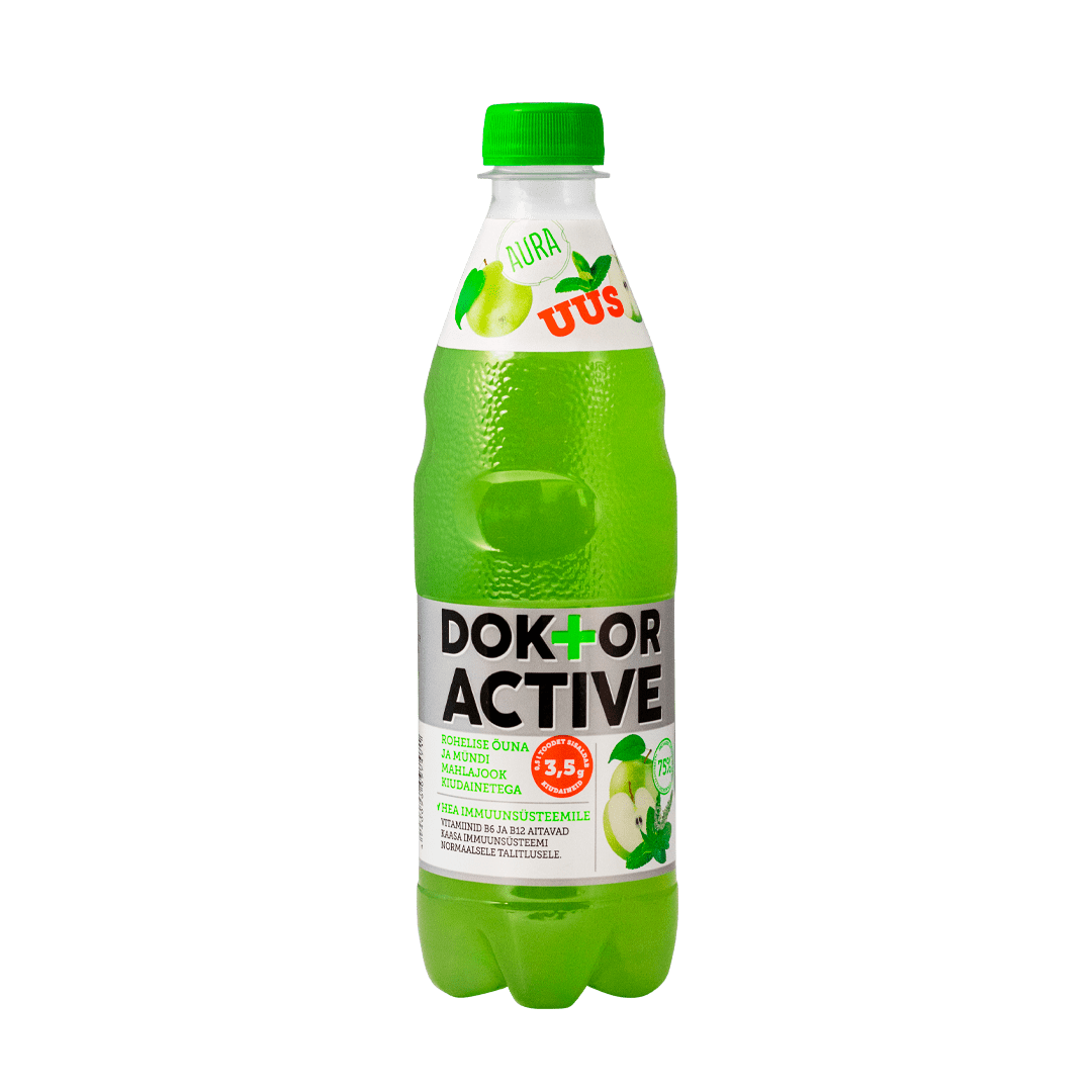 Активный напиток из сока зеленого яблока и мяты с клетчаткой и витаминами. Содержание сока не менее 12% Сокосодержащие напитки «Доктор Актив» изготовлены из сочных и спелых фруктов, обогащены витаминами, полезными для иммунной системы. Сокосодержащий напиток с зеленым яблоком и хрустящей мятой — предвестник весны с живым внешним видом и освежающим вкусом. В дополнение к витаминам в напиток также добавлены полезные для желудка волокна. 0,5 л продукта содержит 75% рекомендуемой суточной нормы витаминов В6 и В12 для взрослого человека. Витамины В6 и В12 способствуют нормальному функционированию иммунной системы. Употребление витаминизированного напитка не заменяет разнообразного и сбалансированного питания и здорового образа жизни. ИНГРЕДИЕНТЫ: вода; яблочный сок из концентрированного сока (12%); сахар; растворимая кукурузная клетчатка (0,7%); регулятор кислотности – лимонная кислота; экстракт мяты (0,02%); ароматизаторы; концентраты – лимонный и сафлоровый; стабилизаторы - Е445, Е414; витамины – пантотеновая кислота, витамин В6, биотин, витамин В12; пищевой краситель – Е133; консерванты – сорбат калия, бензоат натрия.