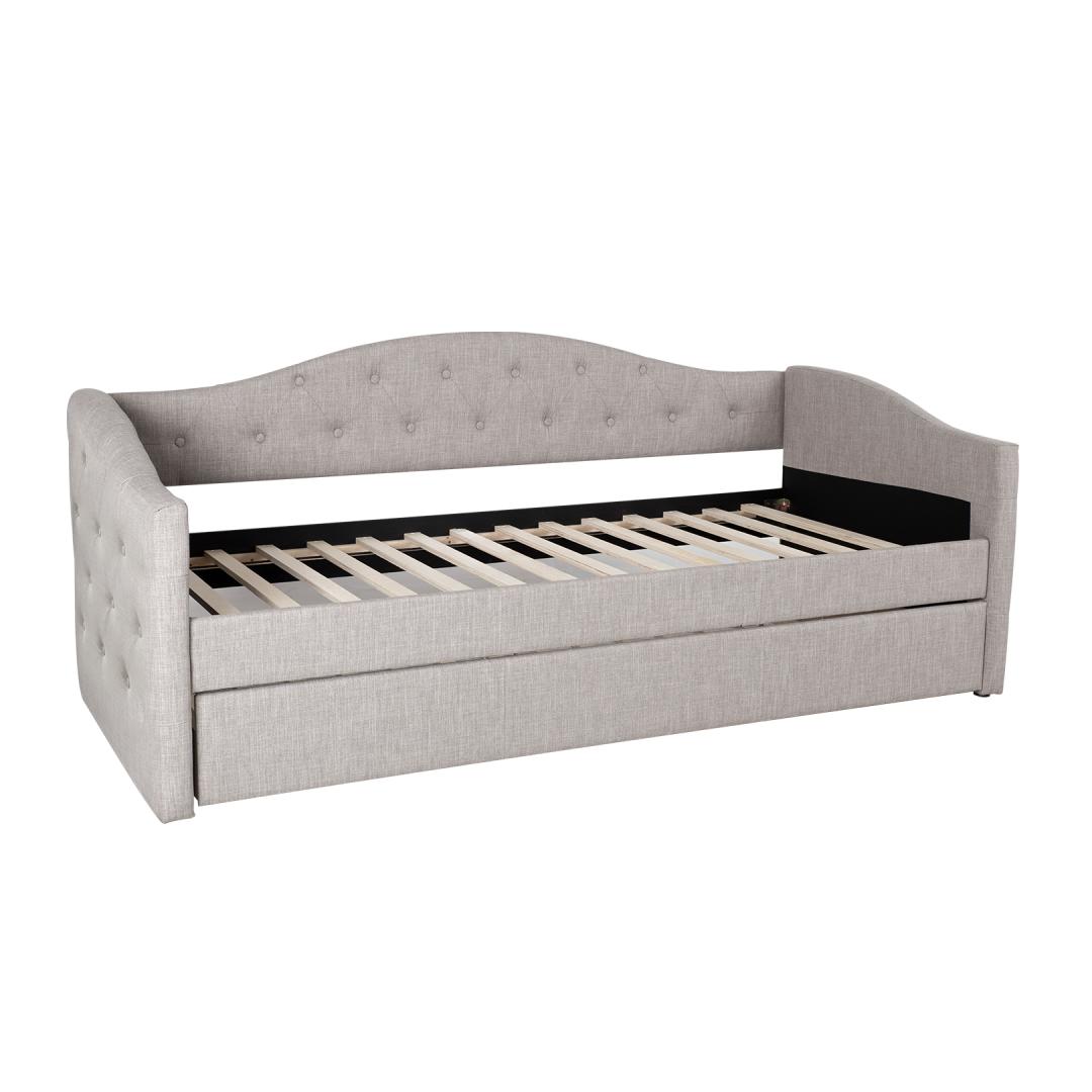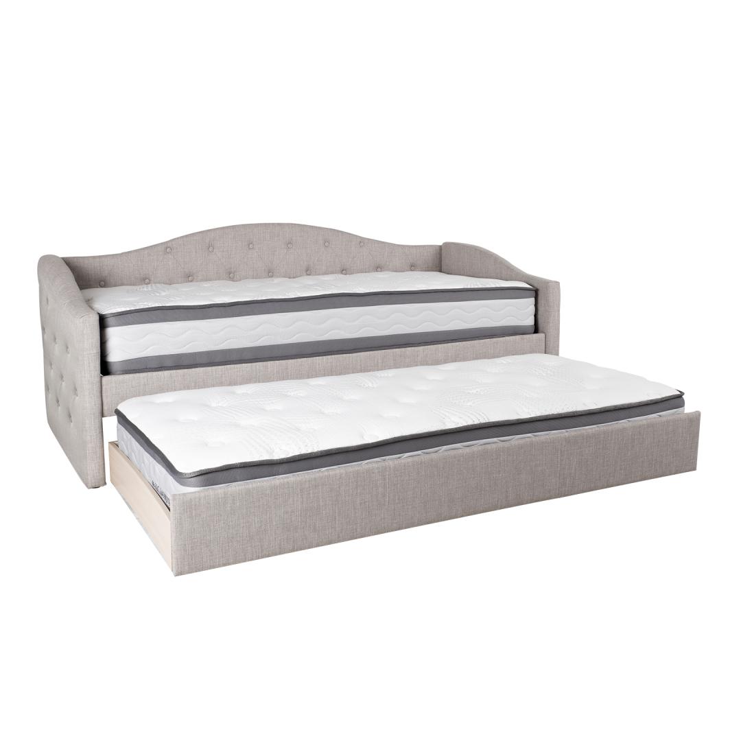 Кровать АТЛАНТА 90х200см, без матрасов, серая. Под кроватью имеется выдвижная секция, которую можно использовать как дополнительное спальное место. Мягкий корпус кровати изготовлен из плиты МДФ и покрыт серой полиэфирной тканью. Матрасы не включены. Размеры подходящих матрасов 90х200см. Высота матраса для дополнительной кровати может достигать 20 см. Базовые флаги входят в комплект. Габаритные размеры кровати 98x221xH94см. Кровать АТLANTA 90x200см, с дополнительной спальной зоной, серая. Под кроватью находится дополнительная раскладывающаяся спальная зона. Компактное решение удобно и просто в использовании. Каркас кровати изготовлен из плиты МДФ и обтянут серой полиэфирной тканью. В комплект входят рейки основания кровати. Матрасы не включены. Подходящие размеры матраса - 90x200 см. Высота дополнительного матраса может достигать 20 см. Размеры изделия 98x221xH43 / 94см.