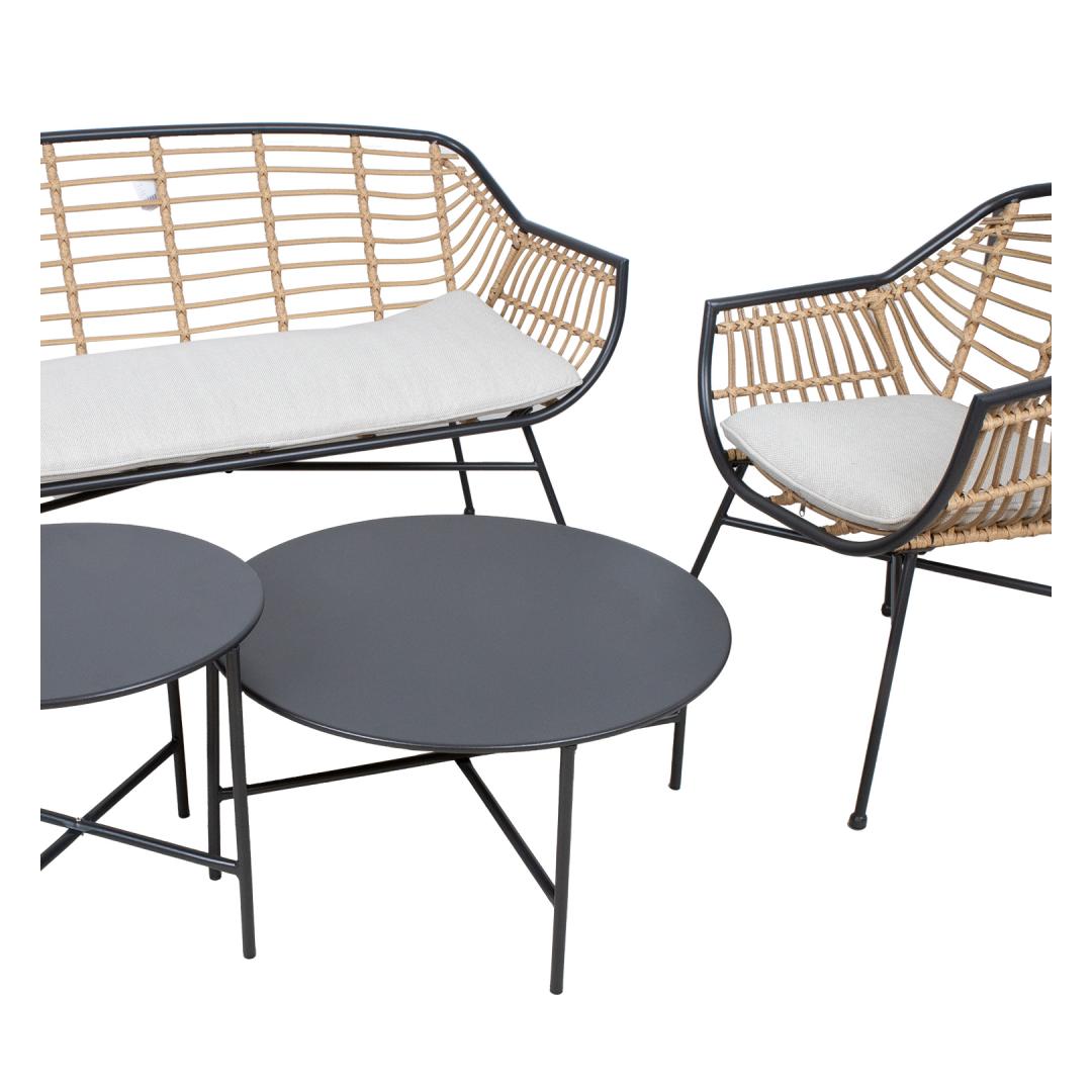 Комплект садовой мебели ЛУНДЕ диван, 2 стула и 2 стола. Каркас дивана и кресла удобной формы изготовлен из стали и покрыт черной порошковой краской. Воздушное пластиковое переплетение, напоминающее натуральный ротанг, придает сиденьям стильный и неповторимый вид. Подушки для сидений входят в комплект. Чехлы на подушки изготовлены из полиэстера бежевого цвета. Пластины и опорная рама столов изготовлены из стали и окрашены черной порошковой краской. Размеры 2-местного дивана 140,5х64хВ85см, размеры кресла 64х64хВ85см, размеры столов Д70хВ35см, Д50хВ45см. Изделие очень прочное в изменяющихся погодных условиях и простое в уходе. Только подушки нуждаются в защите от непогоды. Чтобы продлить срок службы садовой мебели, мы рекомендуем использовать чехлы для садовой мебели. ХРАНЕНИЕ: В конце летнего сезона рекомендуем хранить садовую мебель в помещении. Перед хранением очистите и высушите мебель. Для хранения используйте сухое и хорошо проветриваемое помещение. Комплект садовой мебели LUNDE, диван, 2 стула и 2 стола. Каркас дивана и стула удобной формы изготовлен из стали и покрыт порошковой краской черного цвета. Воздушная пластиковая оплетка, напоминающая натуральный ротанг, придает сиденьям стильный и неповторимый вид. В комплекте подушки для сидения. Чехлы на подушки изготовлены из полиэстера бежевого цвета. Столешницы и основание столов изготовлены из стали и покрыты порошковой краской черного цвета. Размеры 2-местного дивана 140,5х64хВ85см, размеры кресла 64х64хВ85см, размеры столов Г70хВ35см, Г50хВ45см. Изделие устойчиво к переменчивым погодным условиям и очень простое в уходе, только подушки нуждаются в защите от непогоды. Чтобы продлить срок службы садовой мебели, мы рекомендуем использовать чехлы для садовой мебели. ХРАНЕНИЕ: в конце летнего сезона мы рекомендуем хранить садовую мебель в помещении. Очистите и высушите мебель перед хранением. Для хранения используйте сухое, хорошо проветриваемое помещение.