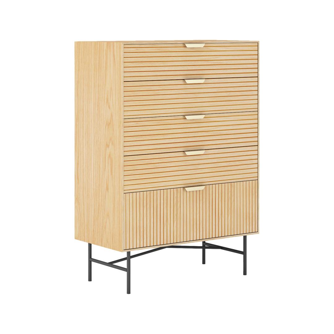 Комод BASSEL с 5 ящиками 80x40xH114см, 3D меламин. Комод изготовлен из меламиновой плиты с декором из светлого дерева. Расходящиеся ребристые передние панели и золотые ручки придают комоду модный вид. Металлические ножки и каркас основания окрашены черной порошковой краской. Kummut BASSEL 5-sahtliga 80x40xH114cm, 3D melamiin. Kummut on valmistatud heleda puidudekooriga melamiinplaadist. Erisuunalised, ribilised esipaneelid ja kuldsed käepidemed annavad kummutile trendika välimuse. Metallist jalad ja alusraam on viimistletud musta pulbervärviga.