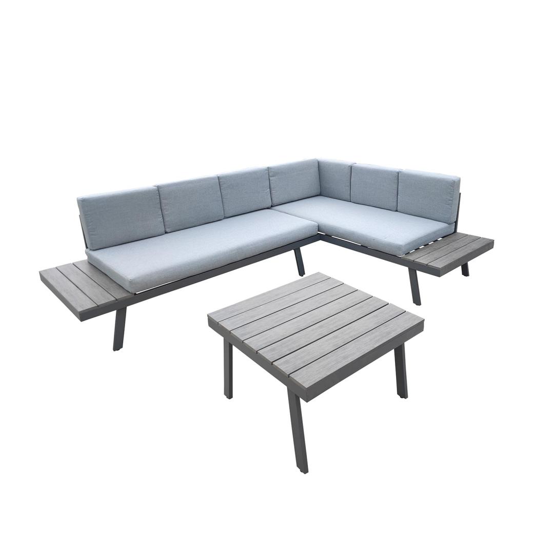 Комплект садовой мебели DELGADO угловой диван и стол. Основная конструкция углового дивана и стола изготовлена из стали и покрыта порошковой краской серого цвета. Столешница и тумбочка по бокам дивана покрыты рейками из искусственного дерева. Подушки для сидений входят в комплект. Чехлы на подушки изготовлены из полиэстера серого цвета. Размеры диванного столика 70х70х45см. Угловой диван состоит из двух частей размерами 180x75xH65см и 182x75xH65см. Изделие очень прочное в изменяющихся погодных условиях и простое в уходе. Только подушки нуждаются в защите от непогоды. Хорошим решением для ежедневного хранения подушек и сохранения их в сухости является наволочка. Чтобы продлить срок службы садовой мебели, мы рекомендуем использовать чехлы для садовой мебели. ХРАНЕНИЕ: В конце летнего сезона рекомендуем хранить садовую мебель в помещении. Перед хранением очистите и высушите мебель. Для хранения используйте сухое и хорошо проветриваемое помещение. Aiamööblikomplekt DELGADO nurgadiivan ja laud. Nurgadiivani ja laua põhikonstruktsioon on valmistatud terasest ja viimistletud halli pulbervärviga. Lauaplaat ja abilaud diivani külgedel on kaetud kunstpuidust liistudega. Istmepadjad kuuluvad komplekti. Padjakatted on valmistatud hallist polüesterkangast. Diivanilaua mõõdud on 70x70xH45cm. Nurgadiivan koosneb kahest osast mõõtudega 180x75xH65cm ja 182x75xH65cm. Toode on muutlikes ilmastikutingimustes hästi vastupidav ja lihtsalt hooldatav. Kaitset ilmastikuolude eest vajavad ainult padjad. Hea lahendus patjade igapäevaseks hoiustamiseks ja kuivana hoidmiseks on padjakast. Välitingimustes kasutatava mööbli eluea pikendamiseks soovitame kasutada välimööbli katteid. HOIUSTAMINE: suvehooaja lõppedes soovitame aiamööblit hoiustada siseruumides. Puhastage ja kuivatage mööbel enne hoiule panekut. Kasutage hoiustamiseks kuiva ning hea ventilatsiooniga ruumi.