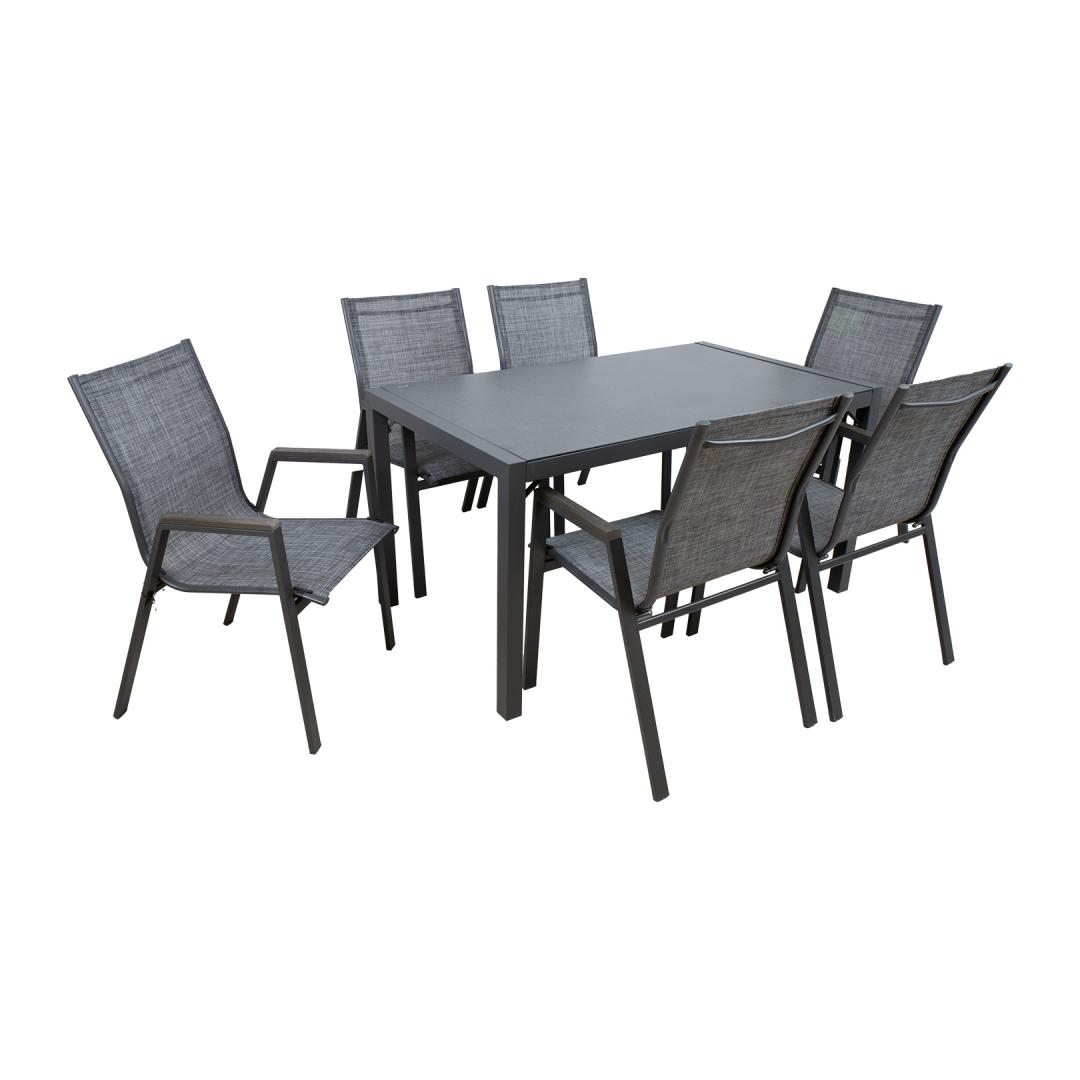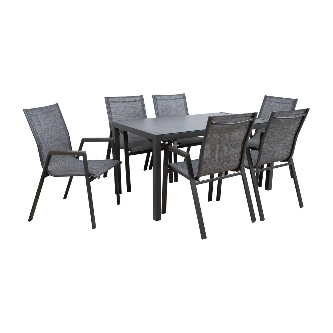 Комплект садовой мебели ДЕЛЬГАДО стол и 6 стульев. Размеры стола 140х80х72см. Столешница: серое закаленное стекло толщиной 5 мм. Ножки и каркас стола и стульев изготовлены из стали и покрыты порошковой краской серого цвета. Текстильное сиденье кресла хорошо пропускает воздух, быстро сохнет и легко чистится. Подлокотники кресла отделаны серыми планками из искусственного дерева. Стулья штабелируются, а их хранение легко и экономит место. Габаритные размеры стула 56х61х90см. Ограничение по весу 100 кг. Aiamööblikomplekt DELGADO laud ja 6 tool. Laua mõõdud on 140x80xH72cm. Lauaplaat: 5mm hall karastatud klaas. Laua ja toolide jalad ja raam on valmistatud terasest ja viimistletud halli pulbervärviga. Tooli textilene iste laseb hästi õhku läbi, kuivab kiiresti ja seda on lihtne puhastada. Tooli käetugedel on hallid kunstpuidust liistud. Toolid on virnastatavad ning nende hoiustamine on lihtne ja ruumi säästev. Tooli üldmõõdud on 56x61xH90cm. Kaalupiirang 100kg.