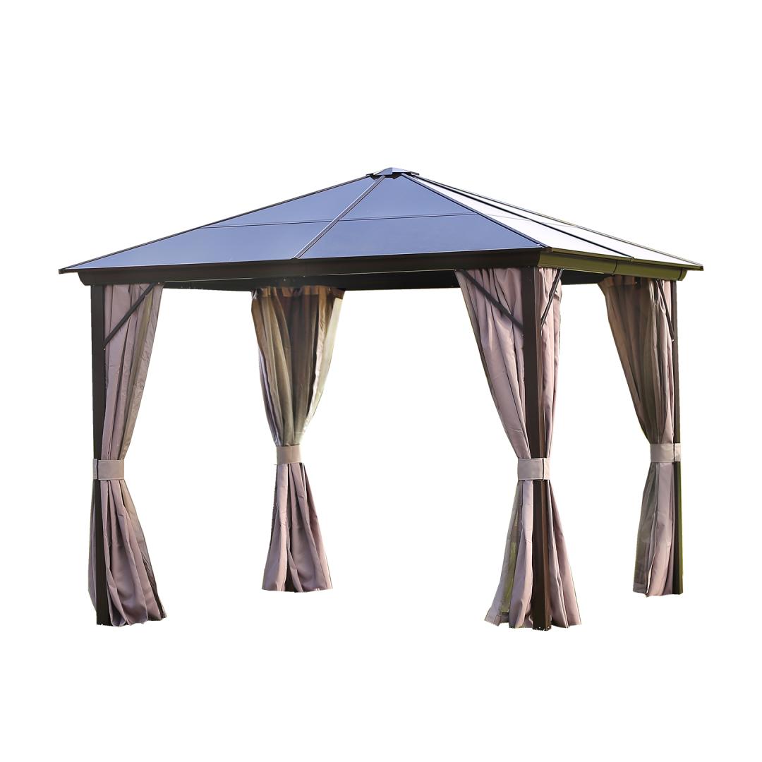 Балдахин SUNSET 3x3xH2,67м, коричневый/серо-коричневый. Элегантный и функциональный навес/садовый павильон обеспечивает защиту и тень как от небольшого дождя, так и от палящего солнца и позволяет наслаждаться пребыванием на свежем воздухе независимо от погоды и времени суток. Со всех сторон навеса имеются шторы из полиэстера (180 г/м²) и нейлоновые москитные сетки на молнии. Основная конструкция навеса изготовлена из алюминия. Все части рамы окрашены коричневой порошковой краской. Размеры боковых стоек 76х76мм, размеры поперечины 116х76мм, ребер крыши 29х26мм. Панели крыши: поликарбонат 6 мм или ламинированный пластик. Поликарбонат — это атмосферостойкий, экологически чистый материал, который предлагает уникальное сочетание долговечности и очень хорошей ударной вязкости. Материал также имеет хорошую светопроницаемость и устойчивость к высоким температурам. ВНИМАНИЕ: Не оставляйте купол без присмотра во время экстремальных погодных условий или штормового предупреждения. Сильный ветер, дождь или снег могут повредить навес. ХРАНЕНИЕ: для продления срока службы навеса рекомендуем в конце летнего сезона разобрать его и хранить в сухом и хорошо проветриваемом помещении. Если навес оставляют на зиму, необходимо следить за тем, чтобы на крыше не скапливалось слишком много снега. Как можно скорее убирайте накопившийся снег. В конце летнего сезона снимите москитные сетки и шторы. Перед хранением очистите и высушите шторы. Алюминиевая рама с порошковым покрытием. Боковая столба 76х76мм, поперечина 116x76мм, ребра крыши 29x26мм. Толщина крышы 6мм. Стенки : полиэстер 180г/м2, противомоскитные сетки из нейлон. Поликарбонат отличается превосходными параметрами светопроницаемости, ударопрочности и термостойкости. ВНИМАНИЕ: шатёр должен быть фиксирован на поверхность. Шатёр не предназначен для использования при сильном ветре и дожде.Продавец не несет ответственности за повреждения, вызванные погодными условиями.