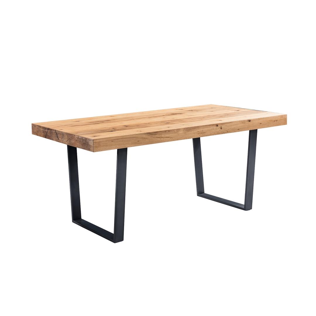 Обеденный стол BYRON 190x100xH76см, дуб. Прочный обеденный стол в деревенском стиле идеально подходит как для современного, так и для классического интерьера. Столешница из МДФ покрыта натуральным дубовым шпоном толщиной 6 мм. Торцы стола украшены срезами древесного ядра, небольшие трещины которого, годовые кольца и шипящие дуги дают представление о сроке жизни дерева. Поверхность древесины обработана масляным воском. Черная стальная ножка стола покрыта эмалью. Для изготовления изделия используется сертифицированная FSC древесина. Söögilaud BYRON 190x100xH76cm, tamm. Soliidne, rustikaalse välimusega söögilaud sobib suurepäraselt nii moodsa kui klassikalise interjööriga. MDF lauaplaat on kaetud 6mm naturaalse tammespooniga. Laua otsi kaunistavad puidu südamiku ristlõiked, mille väikesed praod, aastaringid ja säsikaared annavad aimu puu elukaarest. Puidu pind on viimistletud õlivahaga. Laua must terasest jalg on emailviimistlusega. Toote valmistamiseks on kasutatud FSC sertifikaadiga puitmaterjali.