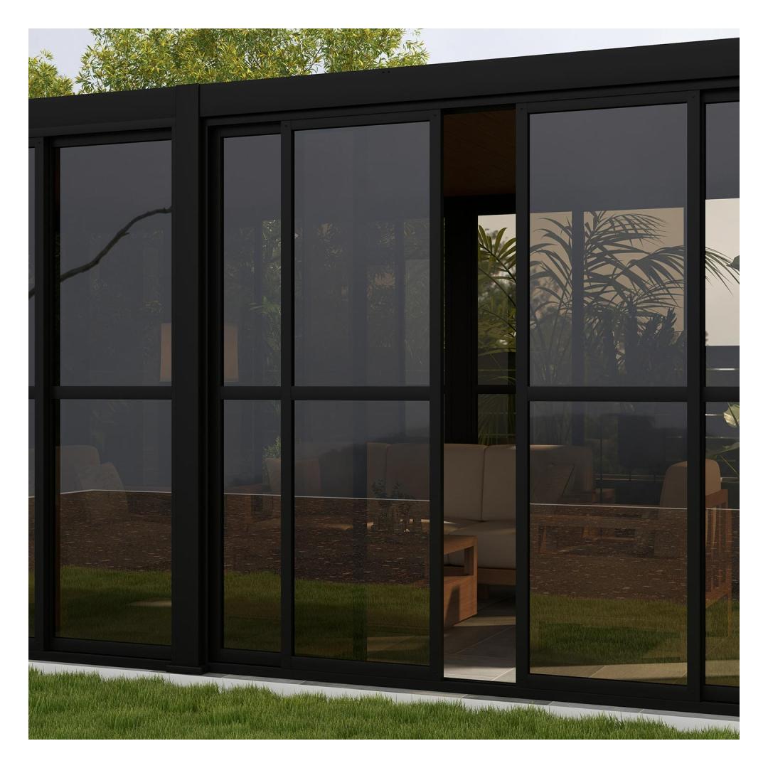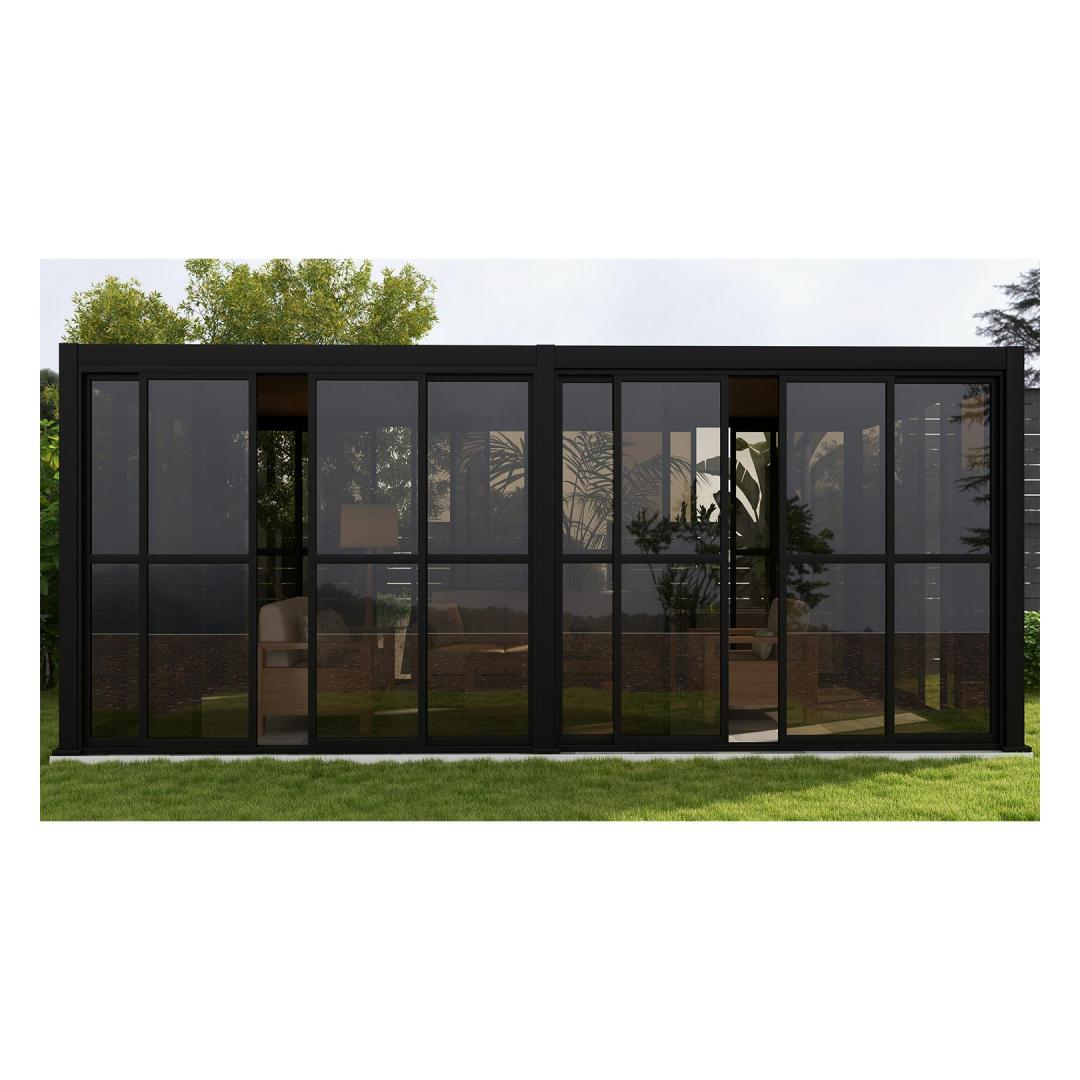Раздвижная стенка из поликарбонатного стекла сбоку от навеса МИРАДОР-111 4м. Размеры стеновой панели 3704х2365мм. Размеры горизонтальной стойки 95х73,9х1,5х1852мм/53х35,5х1,5х917мм/58х35х1,5х917мм. Размеры боковой стойки 46,5х39х1,5х2296мм. Размер панели из поликарбонатного стекла 1080х645х3мм. Каркас стеновой панели изготовлен из алюминия и покрыт порошковой краской темно-серого цвета. Polükarbonaatklaasist lükandsein varikatuse MIRADOR-111 4m küljele. Seinapaneeli mõõdud on 3704x2365mm. Horisontaalposti mõõdud on 95x73,9x1,5x1852mm/53x35,5x1,5x917mm/58x35x1,5x917mm. Küljeposti mõõdud on 46,5x39x1,5x2296mm. Polükarbonaatklaasist paneeli mõõt on 1080x645x3mm. Seinapaneeli raam on valmistatud alumiiniumist ja kaetud tumehalli pulbervärviga.