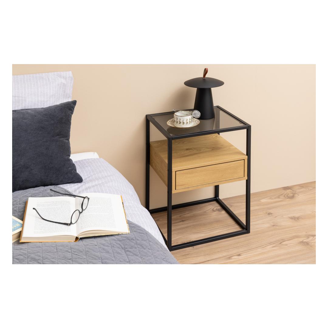 Прикроватная тумбочка с характерным металлическим каркасом идеально подойдет для любой современной спальни. На столешницу из дымчатого стекла можно разместить книги или растения. Внизу есть ящик. Закаленное стекло, металлический каркас с порошковым покрытием. УХОД: Содержите стеклянную поверхность в чистоте, чтобы не поцарапать ее. Распылите очиститель для стекол и протрите тканью из микрофибры или бумажным полотенцем. Используйте подставки и коврики для столов, чтобы не повредить поверхность. В качестве основы используйте ткань, плотно отжатую в мыльной воде, для ежедневной чистки. Чтобы предотвратить появление ржавчины, протрите поверхность насухо. Не трите поверхность твердыми предметами. Iseloomuliku metallraamiga öökapp sobib suurepäraselt igasse kaasaegsesse magamistuppa. Suitsuklaasist lauaplaadile on võimalik asetada raamatuid või ka taimi. All asub sahtel. Karastatud klaas, pulbervärvitud metallraam. HOOLDUS: Hoidke klaasipind puhas, et vältida kriimustusi. Pihustage klaasipuhastusvahendit ja pühkige seda mikrokiudlapi või paberrätikuga. Pinnakahjustuste vältimiseks kasutage klaasialuseid ja lauamatte. Aluse jaoks kasutage igapäevaseks puhastamiseks seebivees tugevasti väänatud lappi. Rooste vältimiseks pühkige pind kuivaks. Ärge hõõruge pinda kõvade esemetega.