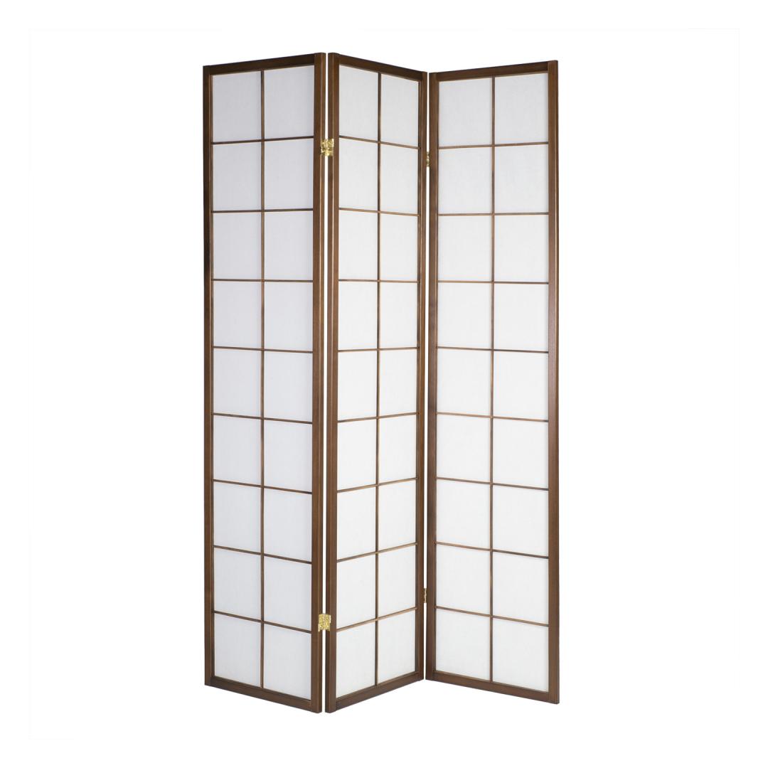 Перегородка ORIENTAL с 3 панелями 130,5x2xH178,5см. Каркас из сосны орех. Внутри рамки белая прозрачная ткань, похожая на бумагу. Ширма ORIENTAL с 3 панелями, 130,5x2xH178,5см, рама из массива сосны коричневого цвета. Внутри рамы белый полупрозрачный нетканый материал, похожий на бумагу.