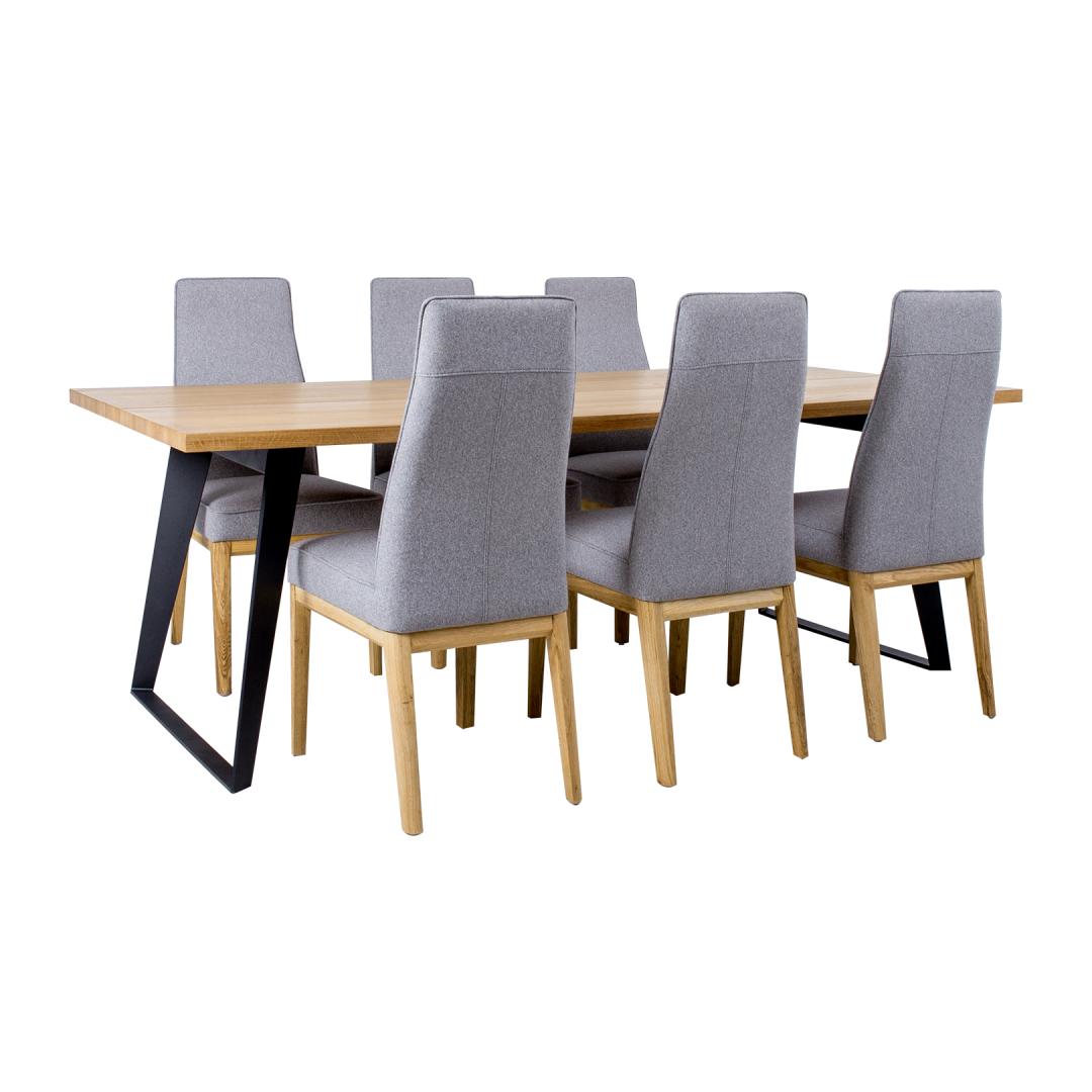 Обеденный стол ЛИССОН с 6 стульями. Большой обеденный стол с хорошо подобранными стульями – сердце дома! Набор обеденных столов LISBON – отличный выбор как для интерьера в традиционном, так и в более современном стиле. Можно купить удлинитель на 50 см (код 18102) на одном или обоих концах стола, с помощью которого можно создать до 3+3 посадочных мест. Массивная столешница из мебельного щита покрыта натуральным шпоном дуба. Края столешницы имеют рейки из массива дерева. Стол покрыт маслом. Металлические ножки покрыты черной порошковой краской. Сиденье и спинка стула обиты и покрыты полиэстеровой тканью серого цвета. Ножки и каркас стула изготовлены из древесины дуба. Размеры стола 220х100х75см. Размеры стула 46x58,5xH102см, предел веса 100кг. УХОД: Защищайте шпонированную поверхность от попадания жидкостей. Любую жидкость, пролитую на стол, следует немедленно вытирать мягкой, слегка влажной тканью. Всегда используйте настольные коврики и нагревательные коврики. Обеденный комплект LISBON с 6 стульями, ДСП с натуральным шпоном дуба, черные металлические ножки. Столешница: ДСП с натуральным шпоном дуба, с массивным кантом. Столешница состоит из двух панелей. Отделка: промасленный. Удлинитель LISBON 50x100см продается отдельно, код 18102. Стул 46x58,5xH102см, серая ткань, ножки из дуба. Материал покрытия: 100% полиэстер. Максимальный вес 100 кг.