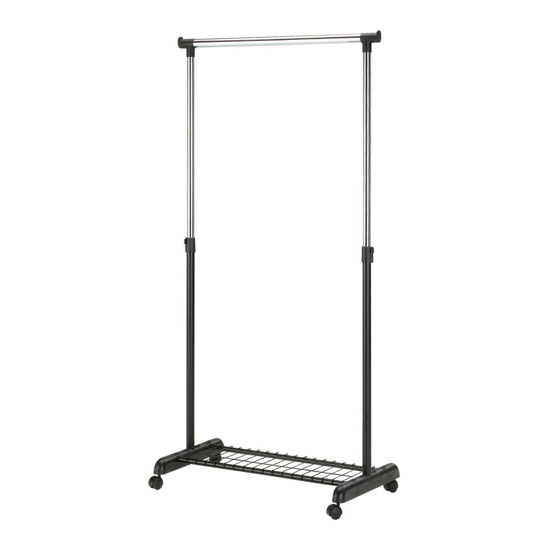 Штанге FRANK 83x43xH93,5-168см, черный/хром. Передвижная штанга с регулируемой высотой на колесиках — простое и практичное решение для организации одежды и обуви. Опорная рама Stange изготовлена из черного пластика, боковые стойки и подвесная труба изготовлены из хромированной стали. В нижней части бара находится полка для обуви. Грузоподъемность 15 кг.